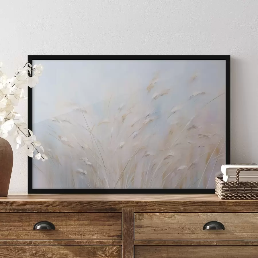 Medvilnės žolė ir kita sausa žolė priešais neryškią jūrą, švelni ir prislopinta spalvų paletė
