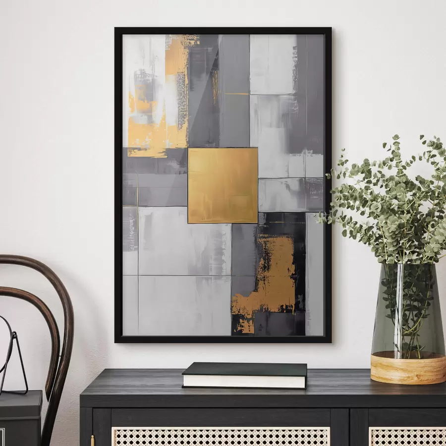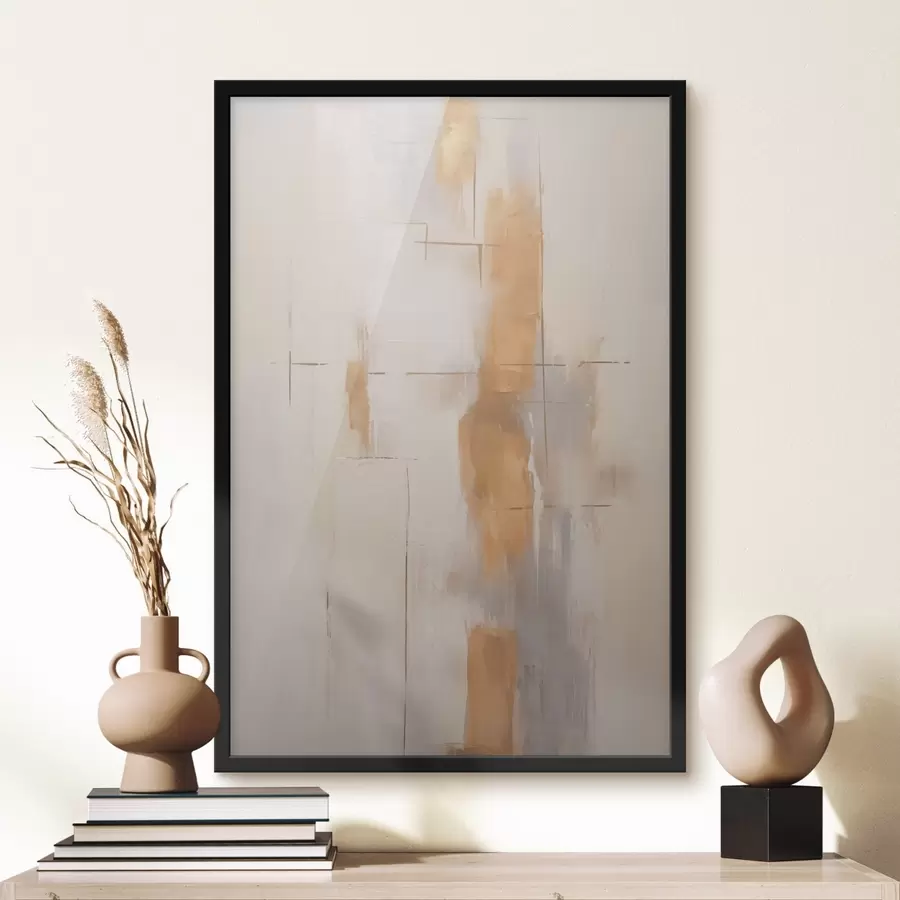 Abstrakti šiuolaikinė geometrinė kompozicija su persidengiančiomis formomis ir pilkų, juodų ir smėlio atspalvių spauda