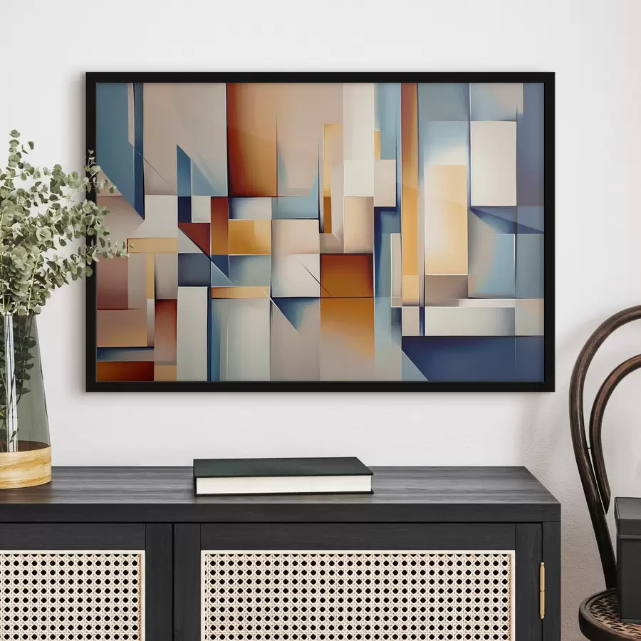 Mėlynos, oranžinės ir rudos spalvos abstrakčios geometrinės figūros sukuria modernią minimalistinę kompoziciją