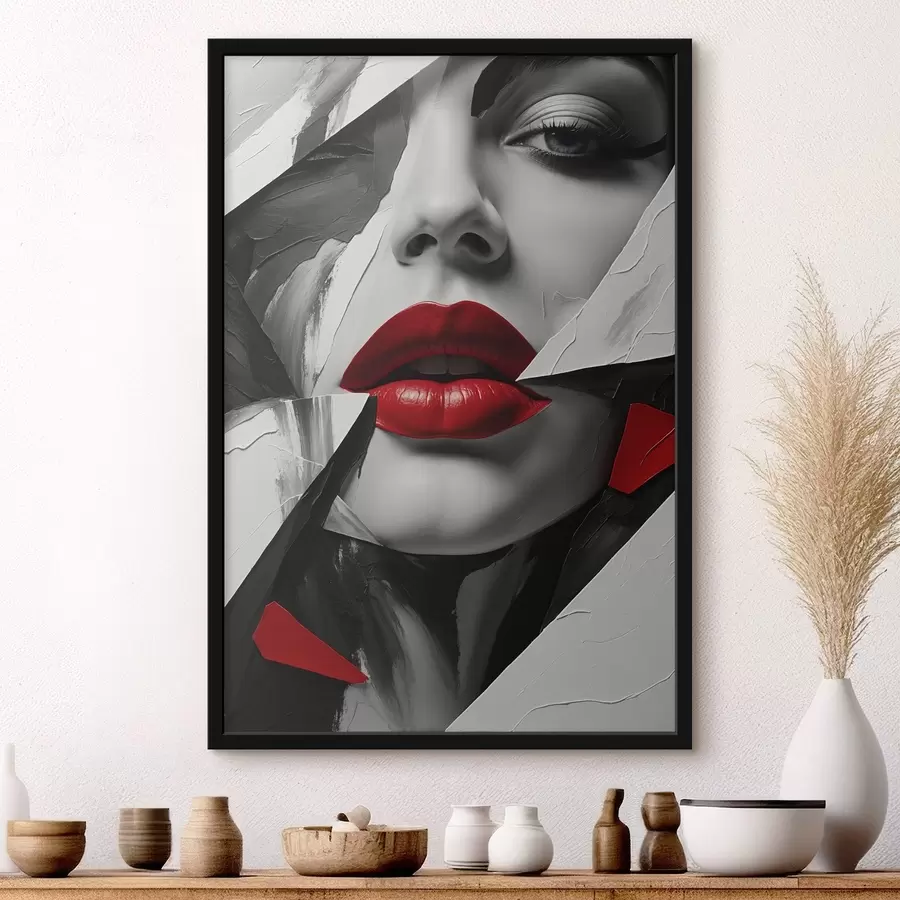 Abstraktus jaunos moters su akiniais nuo saulės portretas su rausvomis lūpomis ir abstrakčiomis formomis bei rausvos spalvos purslais