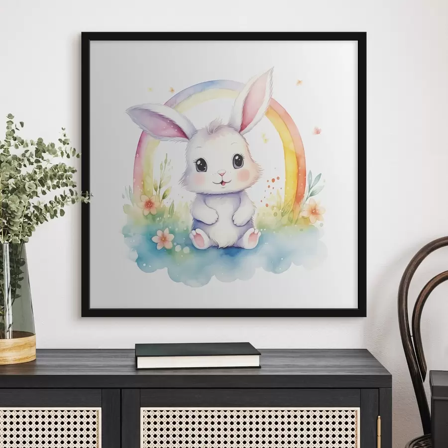 Mažas baltas šuo šokinėja tarp ramunėlių mėlyname akvarelės fone