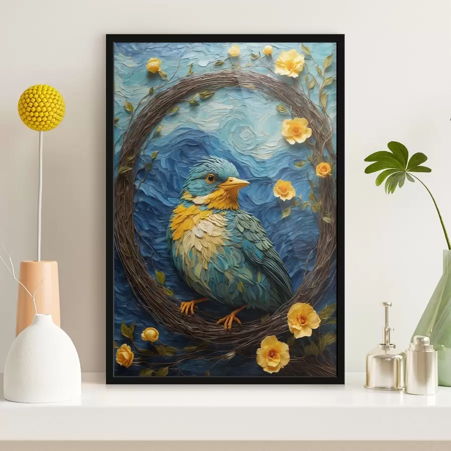 Paukščiai ant sakuros šakos aliejinės tapybos stiliumi