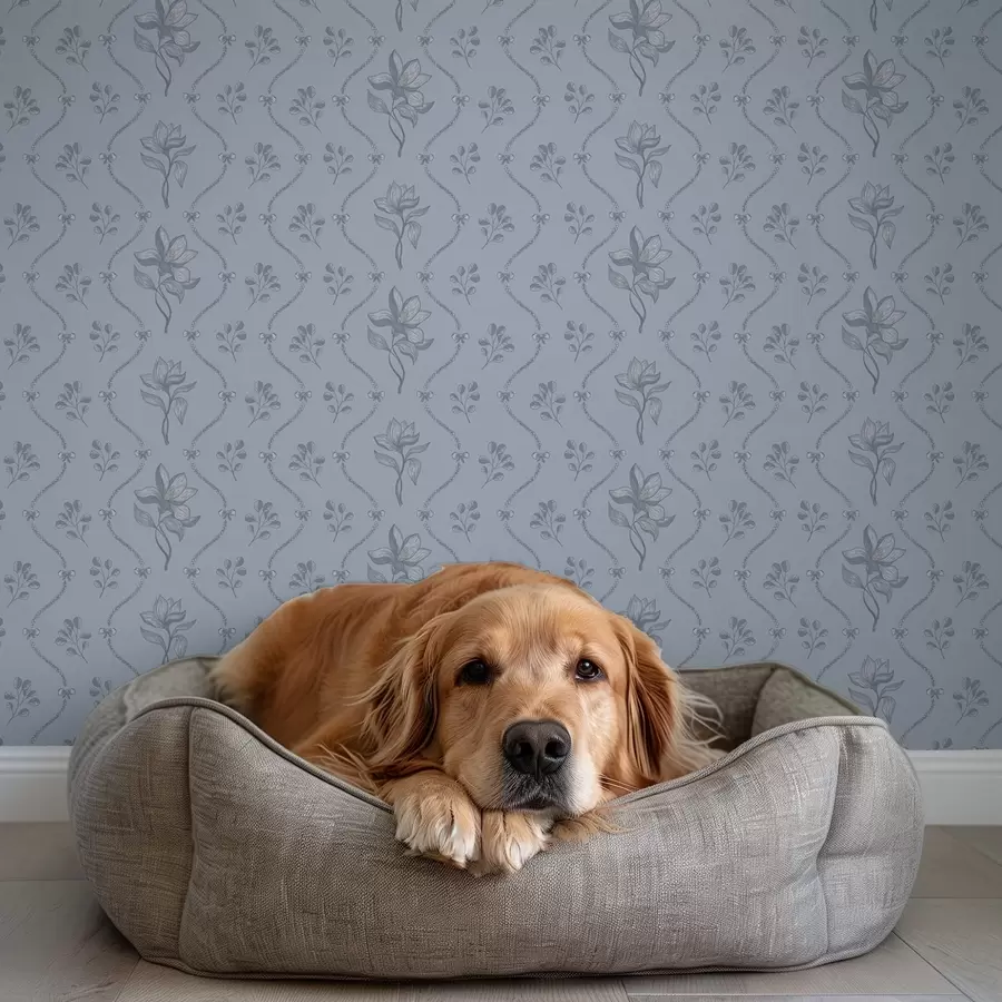 Mažos gėlės ir juostelės pilkai mėlynos spalvos paletėje