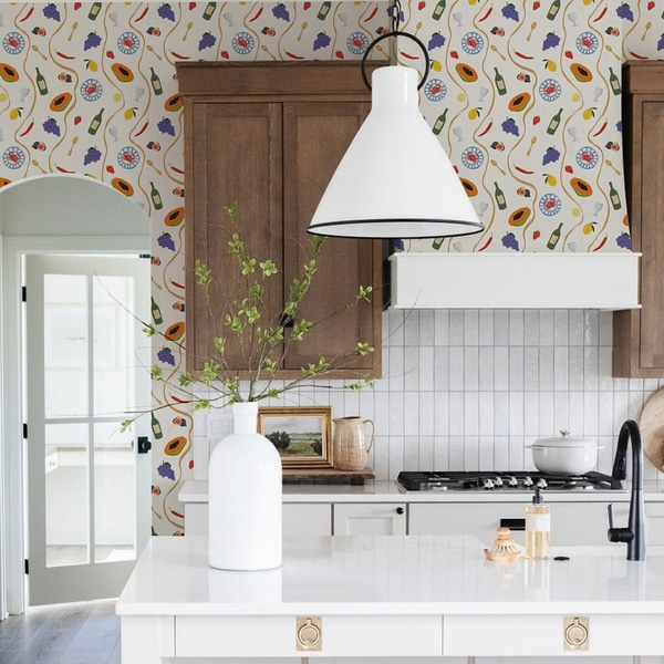 Scena su švyturiu, medžiais ir namais sienos spalvos fone