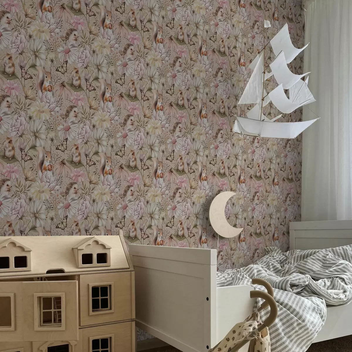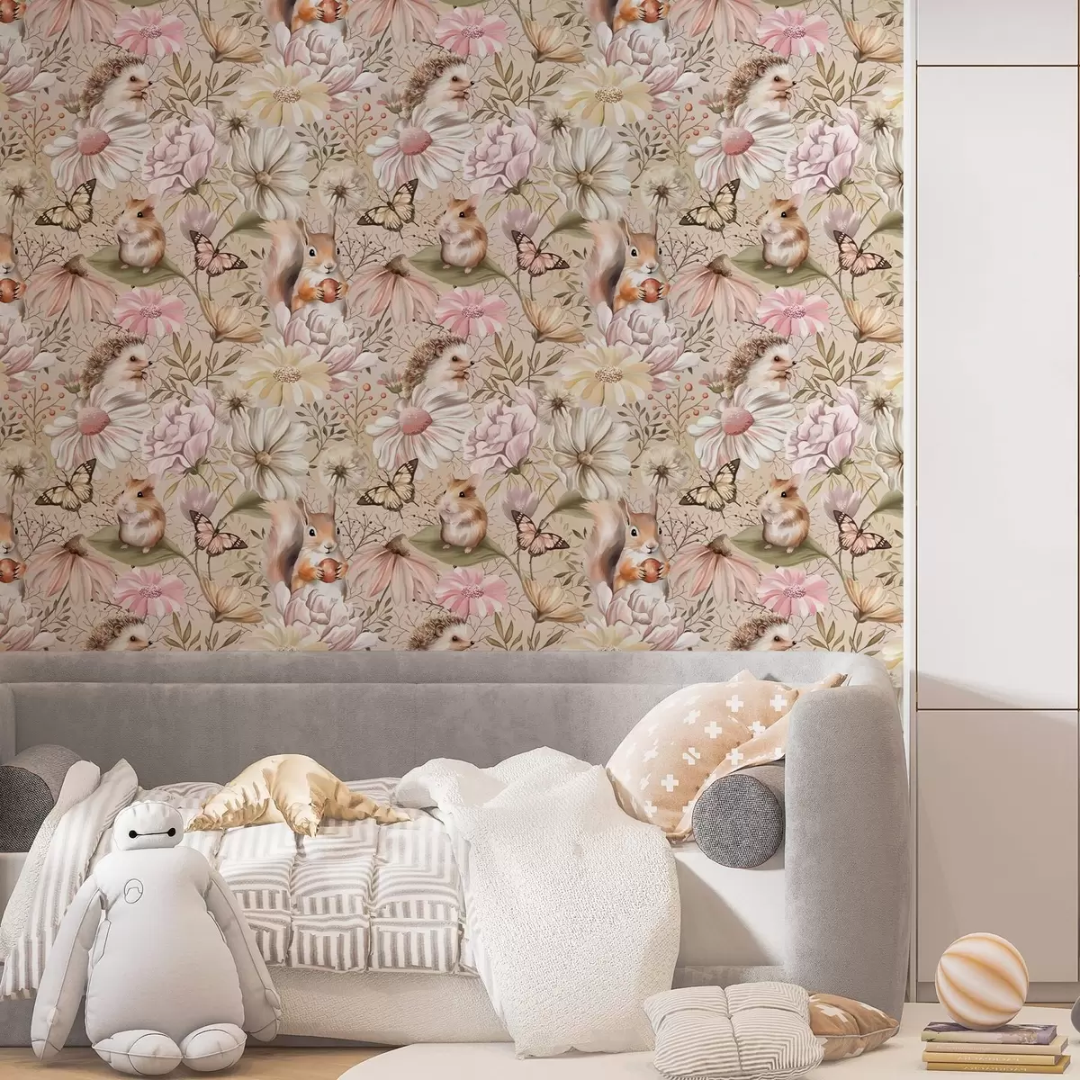 Tapetai Mielas ežiukas, voverė, žiurkėnas ir drugeliai su pastelinių spalvų gėlėmis Nr. a00051