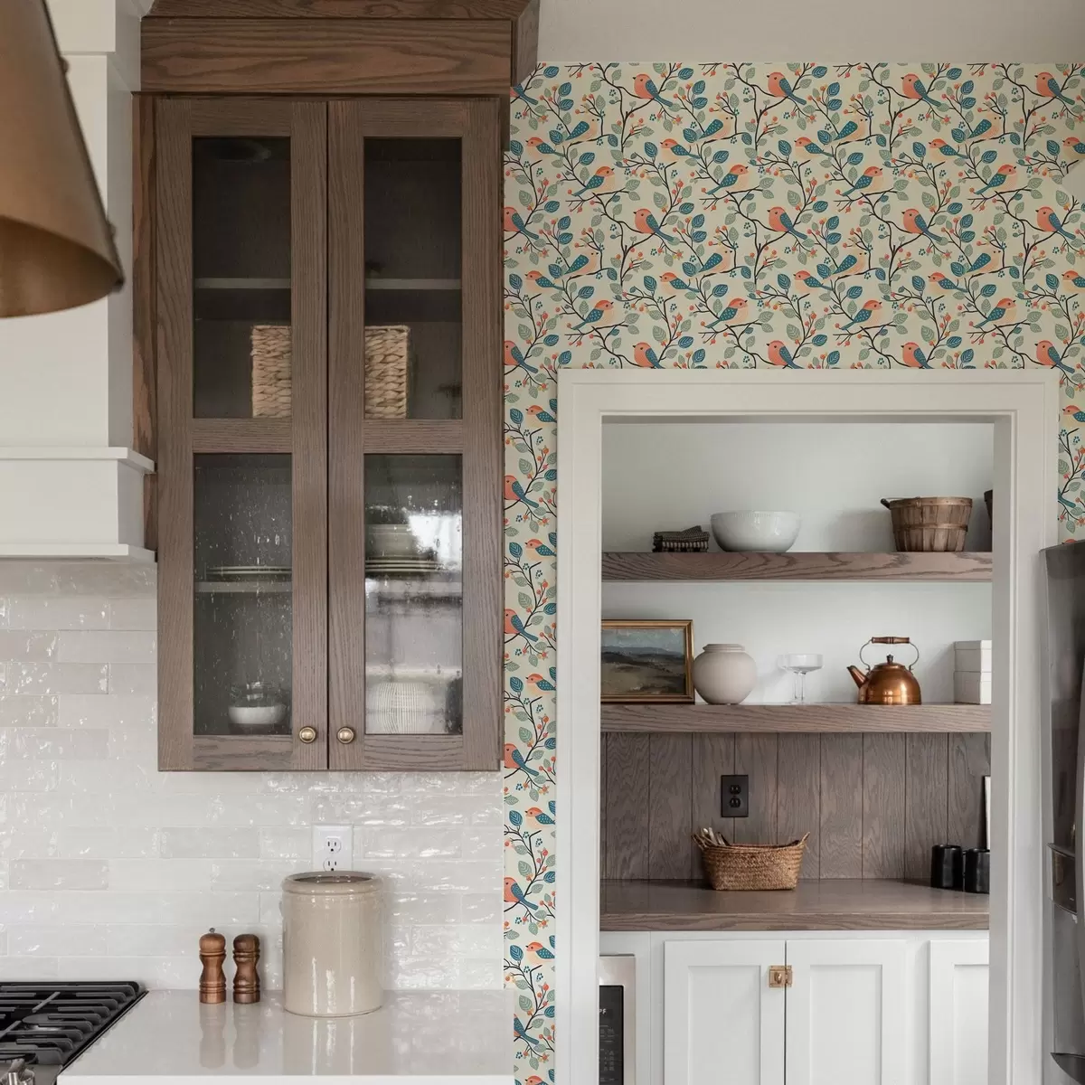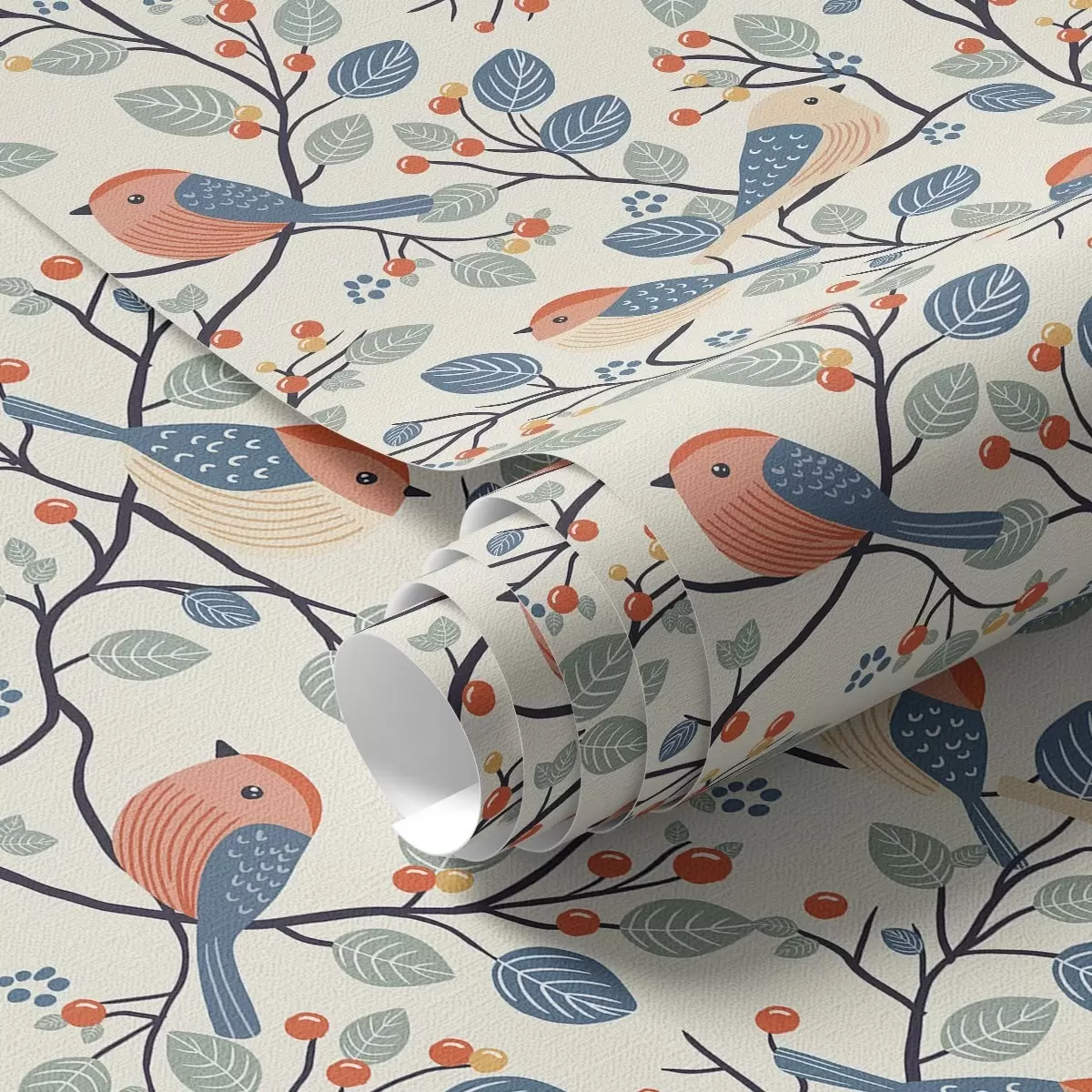 Tapetai Šiltų spalvų paukščiai ant šakų ir uogų Nr. a00128v1