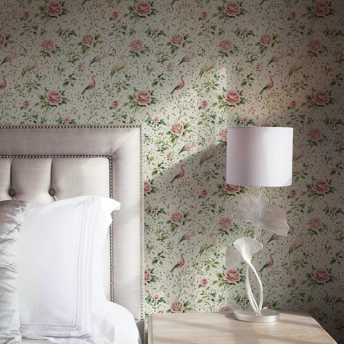 Tapetai Pastelinės rožinės spalvos rožės ir paukščiai šabakštyno stiliumi Nr. a00201