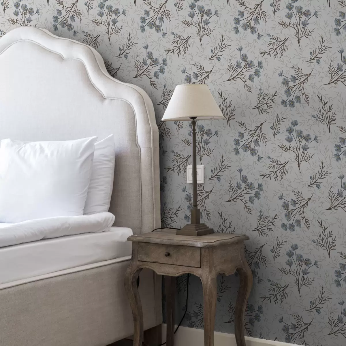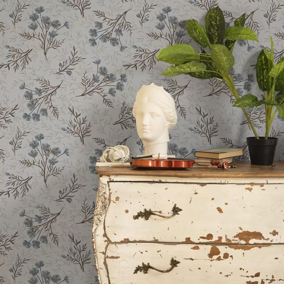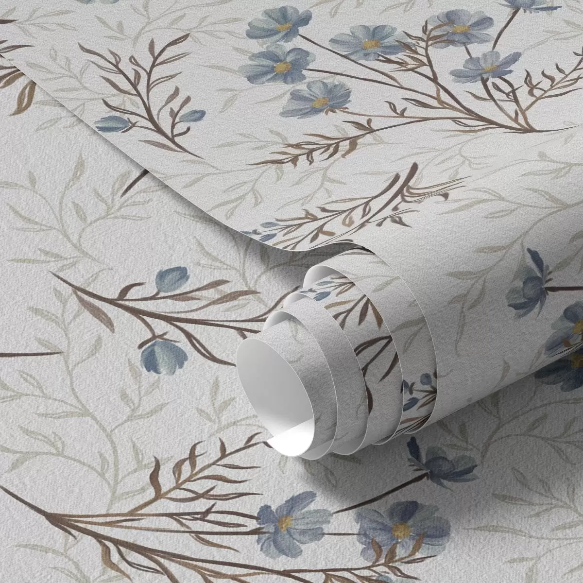 Tapetai Mėlynos gėlės ir šviesios šakos baltame fone Nr. a00265v1