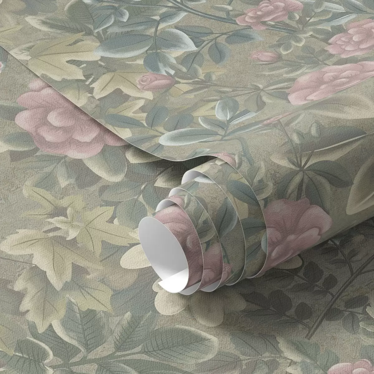 Tapetai Rožinės gėlės ir lapai pasteliniame žaliame fone Nr. a00306