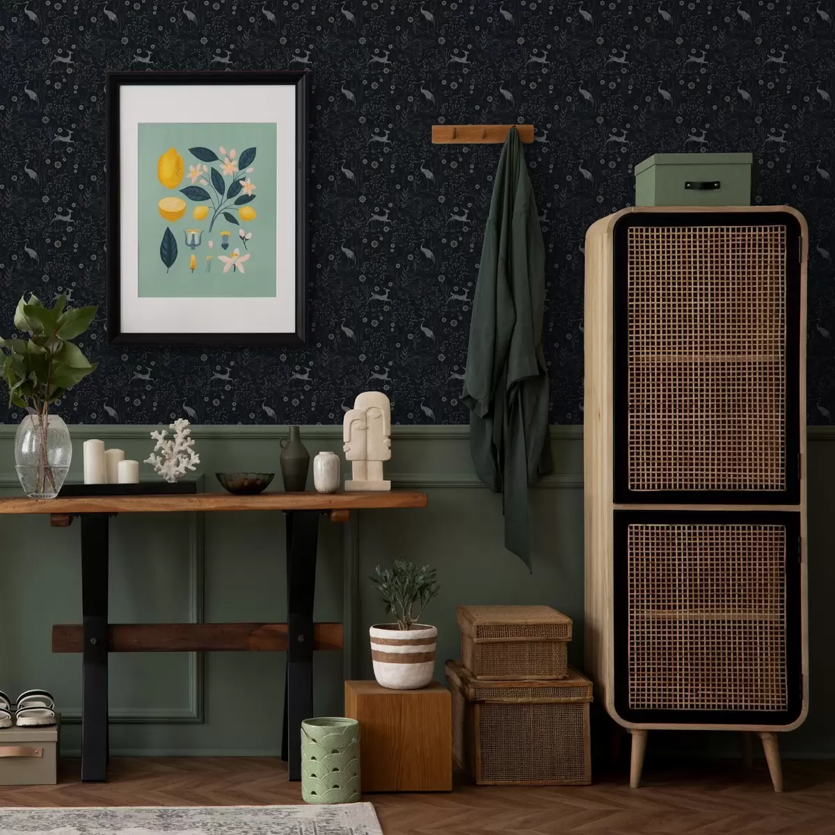 Tapetai Tamsus fonas su baltais paukščiais ir elniais Nr. a00363