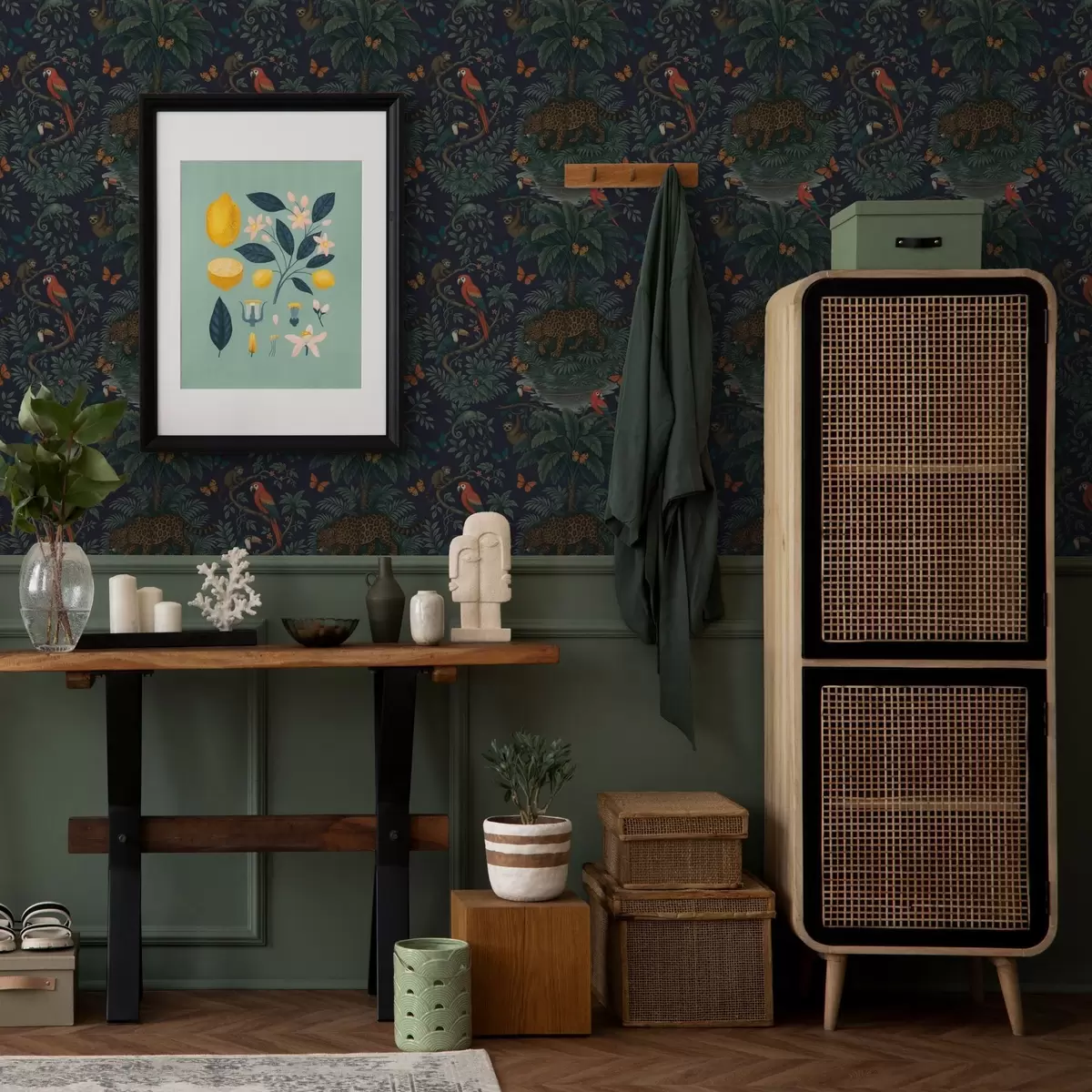 Tapetai Atogrąžų džiunglės su leopardu, leopardu, papūgomis ir drugeliais Nr. a00388