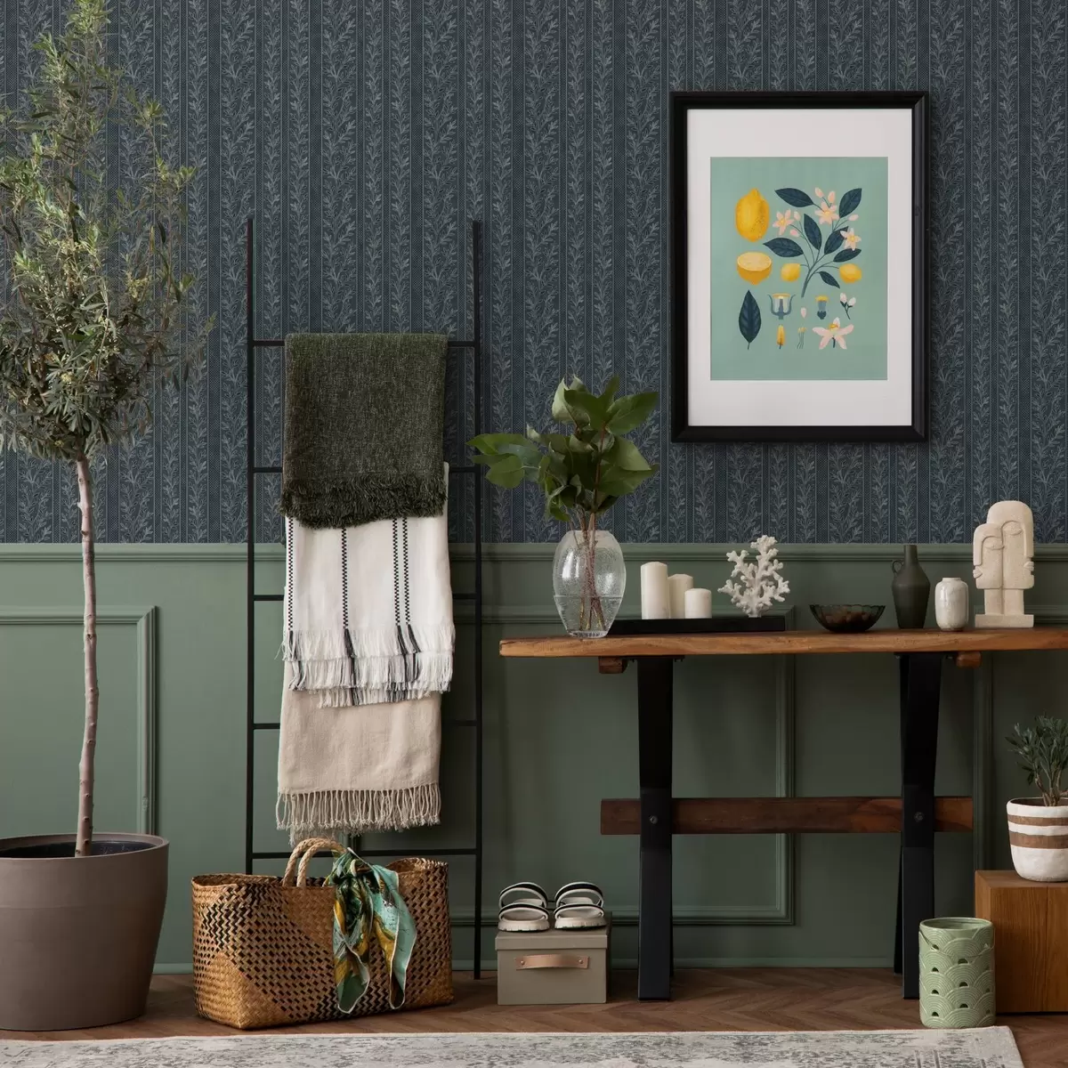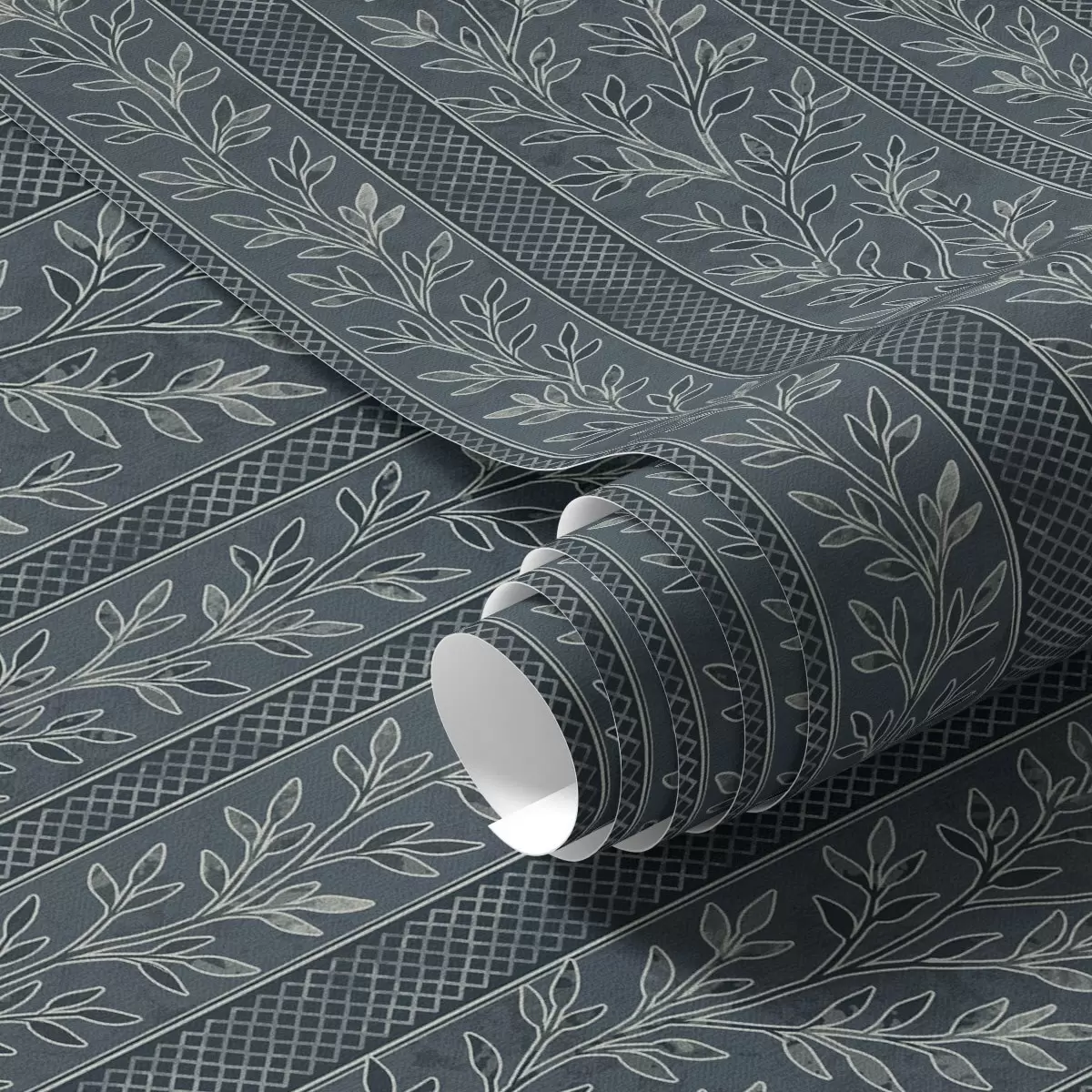 Tapetai Dryžuotas raštas su šakelėmis mėlyname fone Nr. a00425