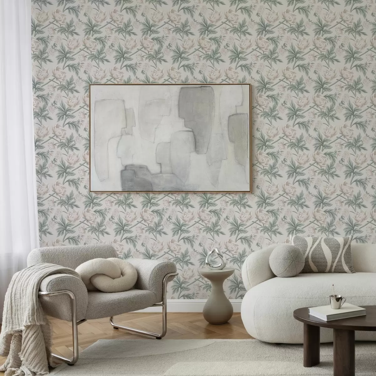 Tapetai Gausūs šviesiai smėlio ir žalios spalvos smėlio ir žalios spalvos bijūnai Nr. a00445