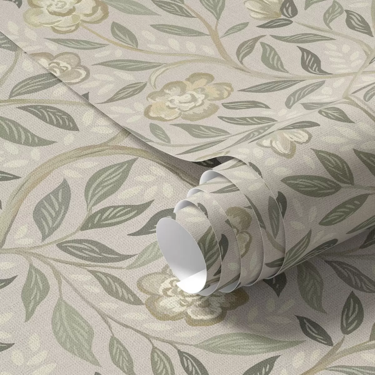 Tapetai Kreminės rožės ir alyvuogių lapai dulkėtame rožinės spalvos fone Nr. a00455