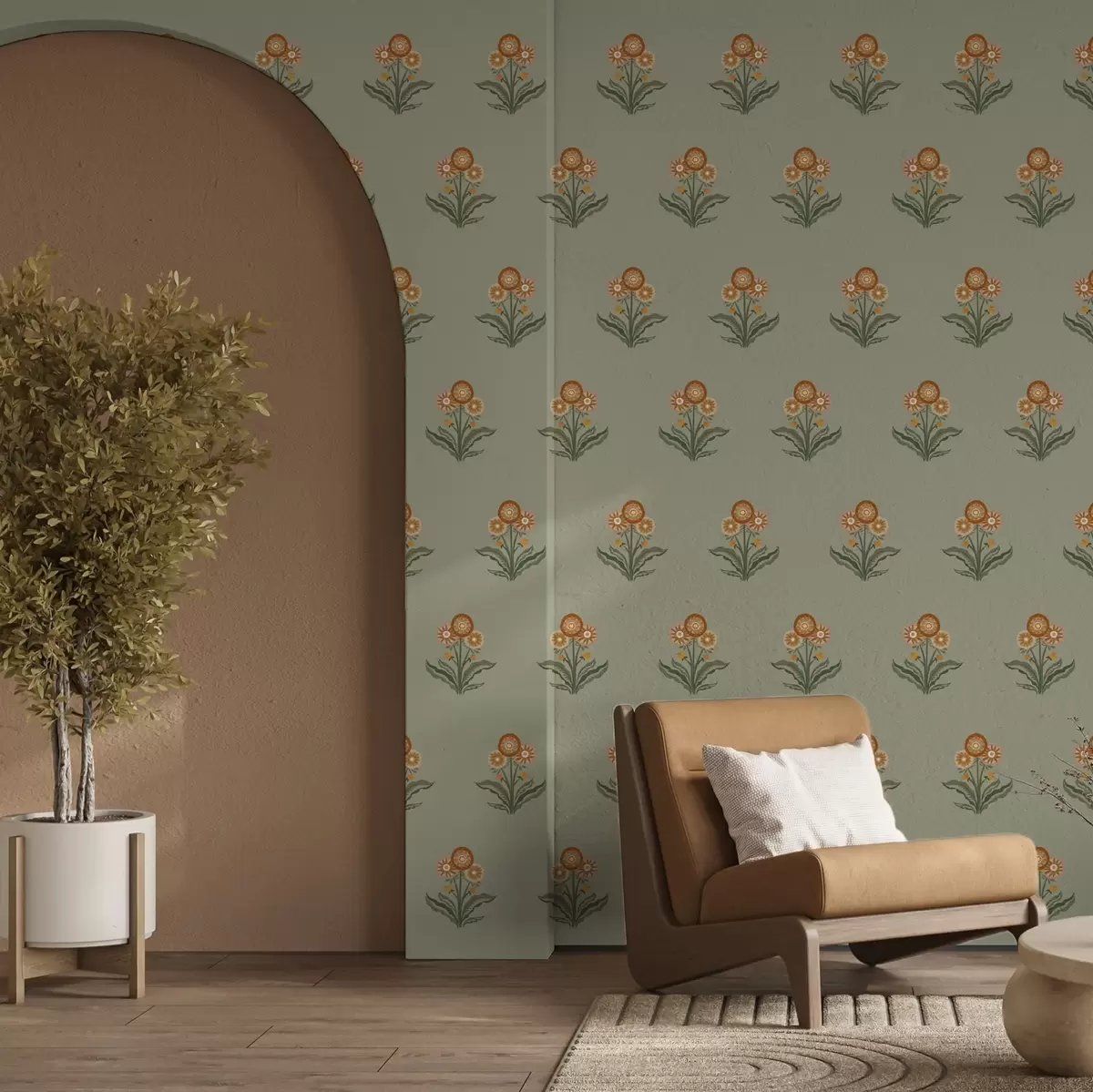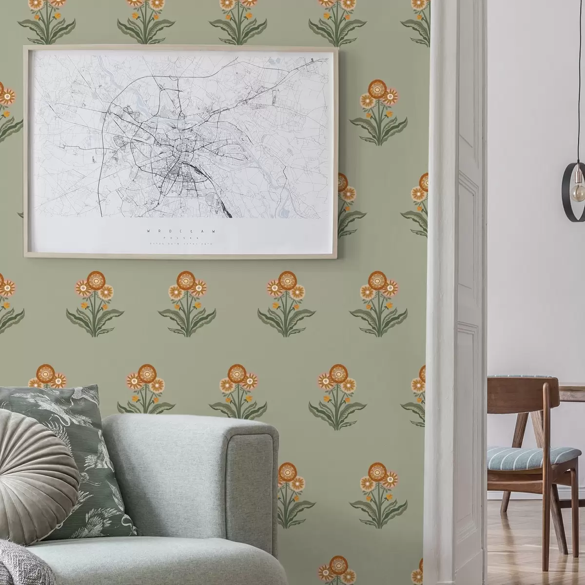 Tapetai Stilizuotos gėlės ant alyvuogių fono, šiltos spalvos Nr. a00494v2