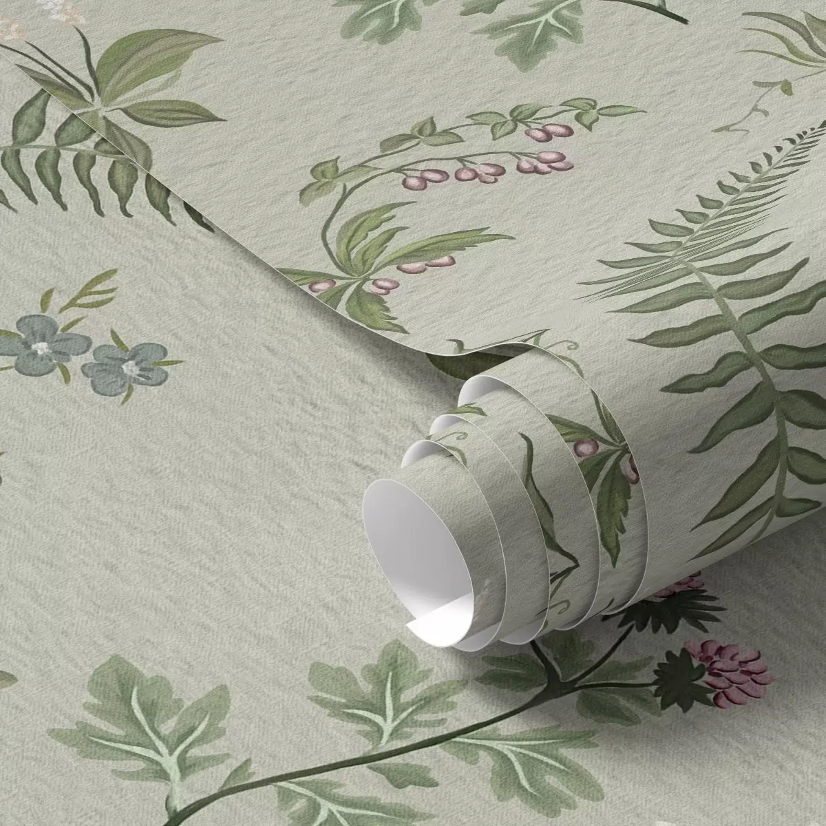 Tapetai Botaninės žolės ir paparčiai ant šviesiai pilkai žalios spalvos Nr. a00498