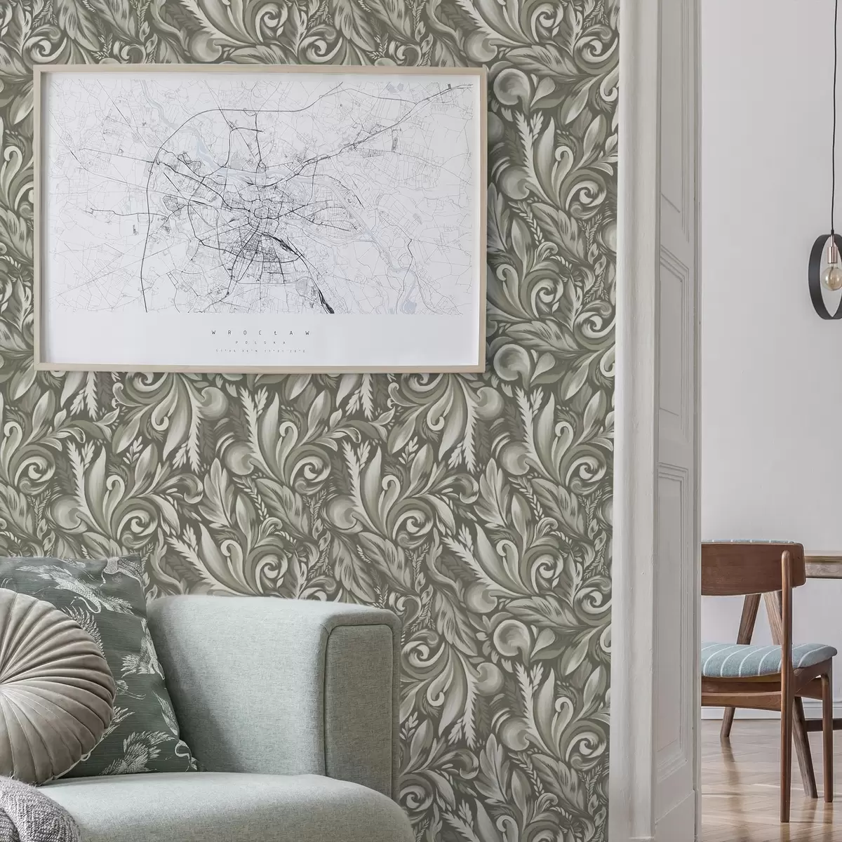 Tapetai Akanto lapai alyvuogių-smėlio spalvų paletėje Nr. a00501