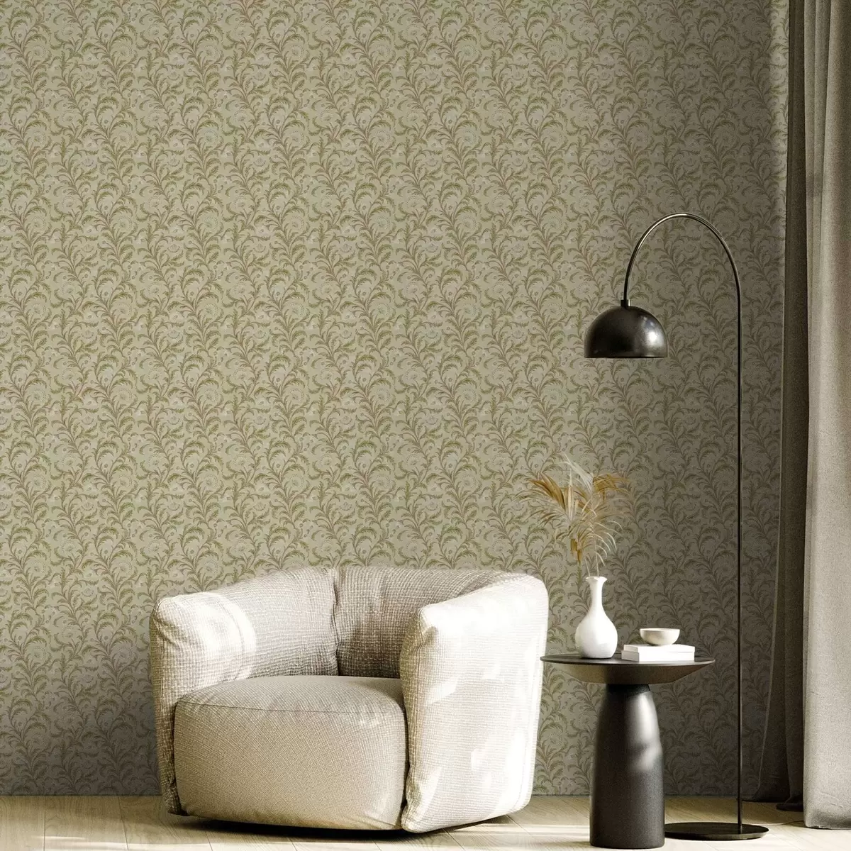 Tapetai Vintage ornamentas su voliūromis ir gėlėmis, smėlio ir alyvuogių spalvos Nr. a00574