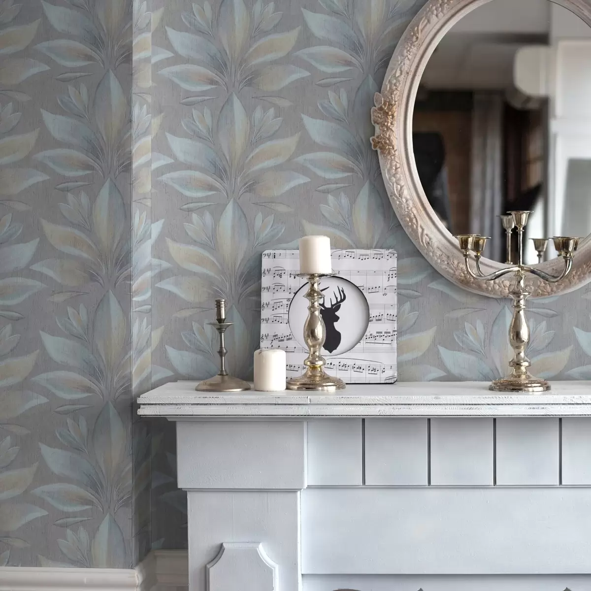 Tapetai Didelės stilizuotos lapų formos detalės mėlynos ir smėlio spalvų paletėje ant pilkos fono Nr. a00601