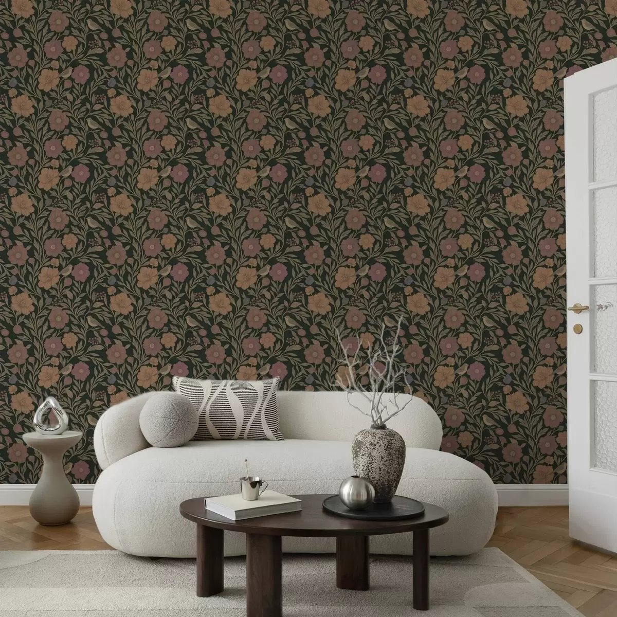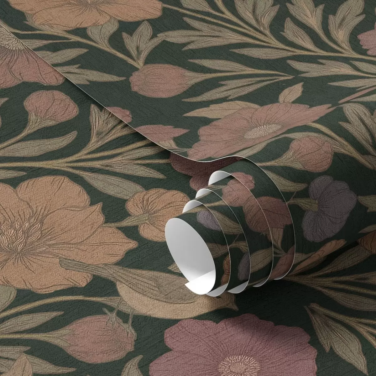 Tapetai Rudens gėlės ir paukščiai ant tamsiai smaragdo fono Nr. a00605v1