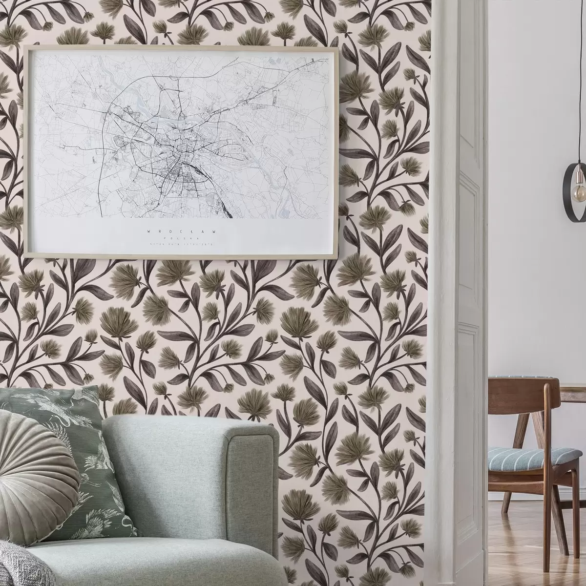 Tapetai Pilkos-alyvuogių atspalvių lauko gėlės ant kreminės spalvos fono Nr. a00623v1