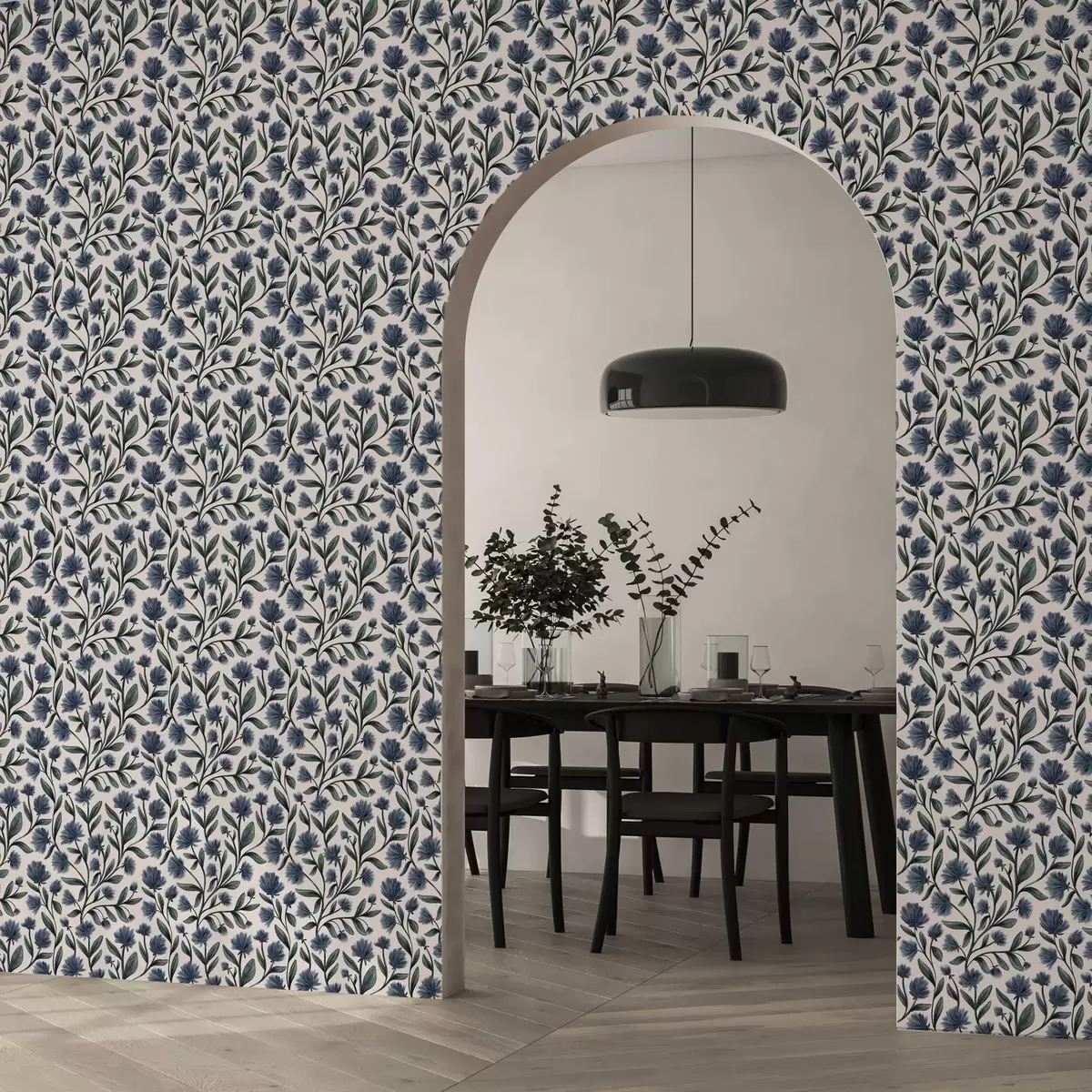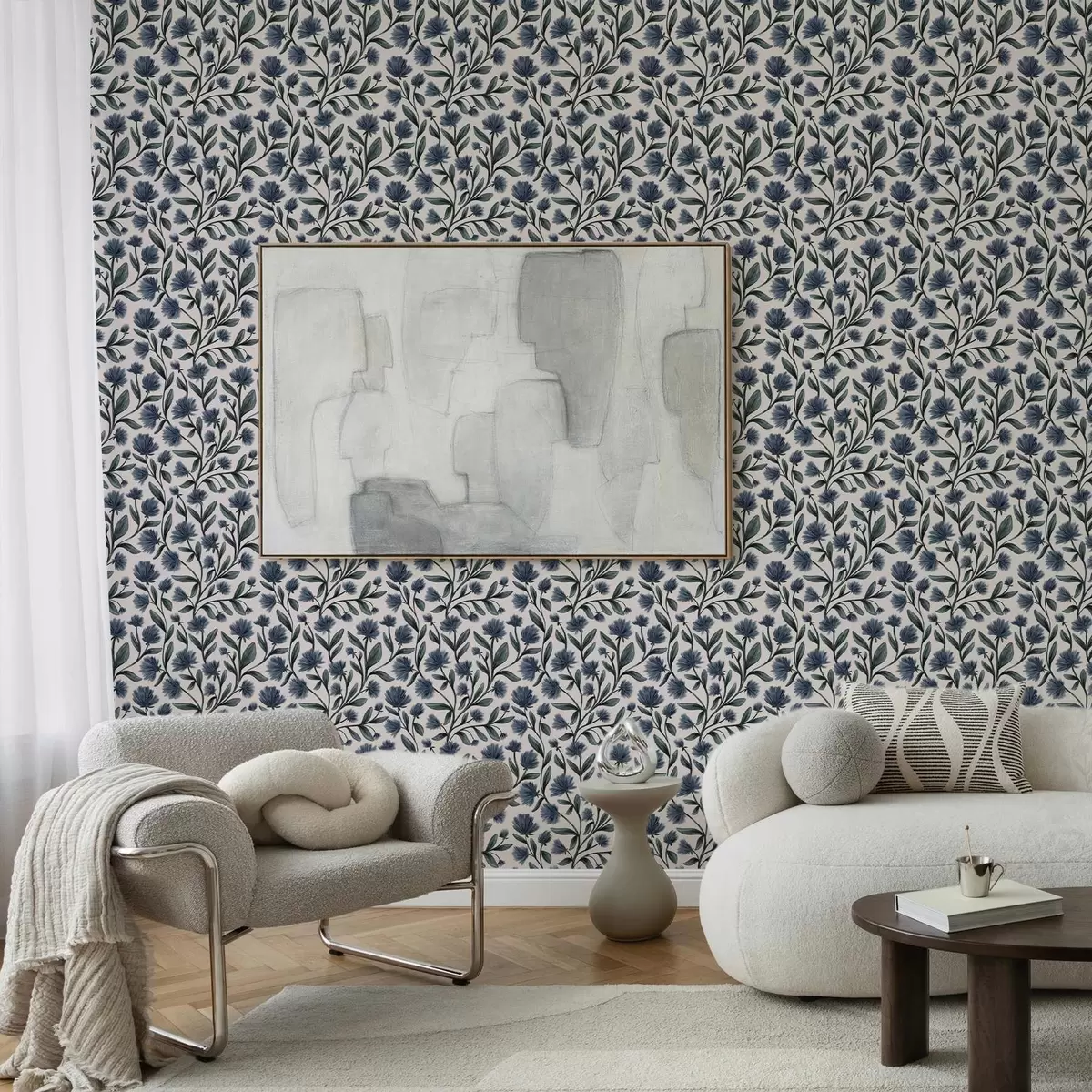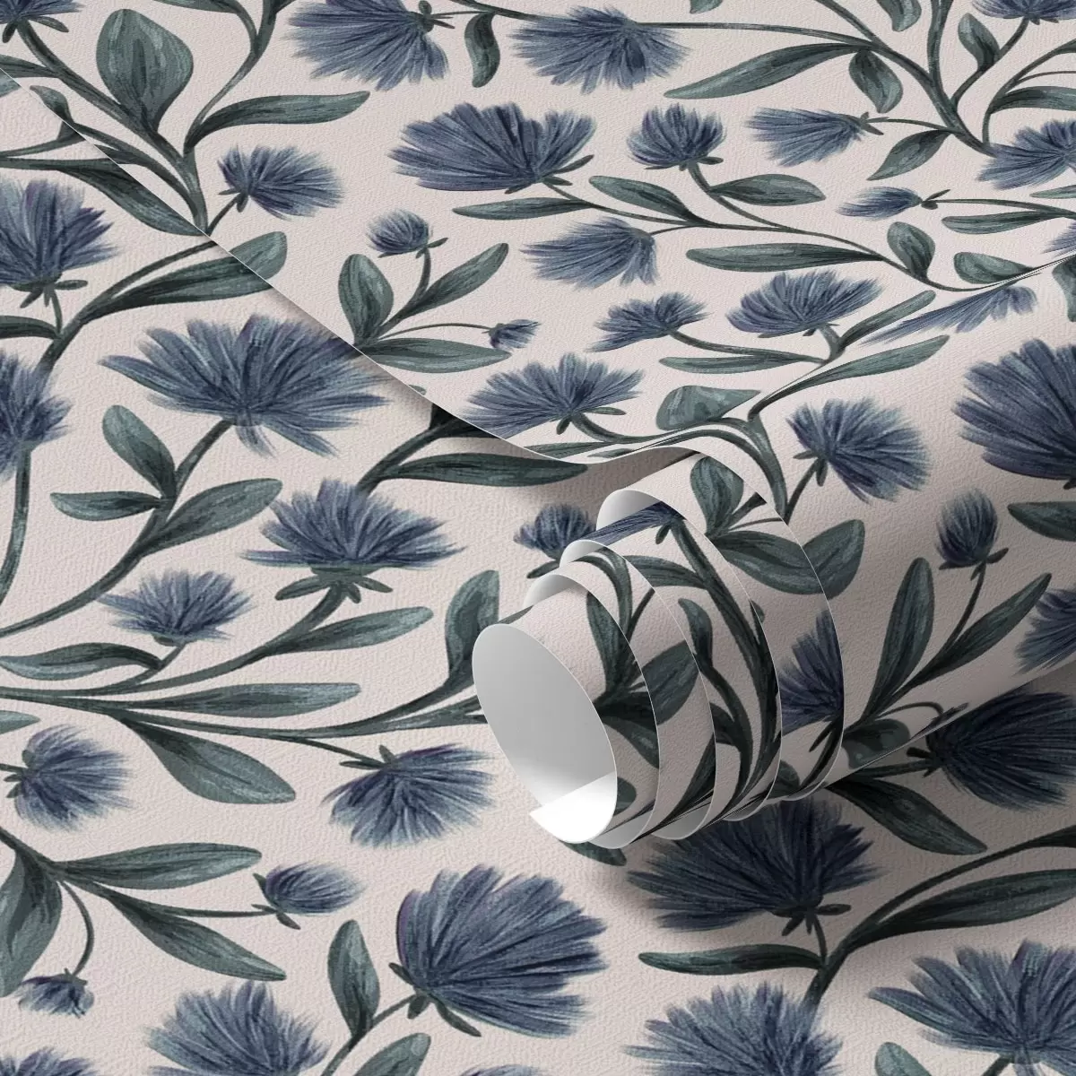 Tapetai Mėlynos ir žalios spalvų paletės laukinės gėlės ant kreminės spalvos fono Nr. a00623v2