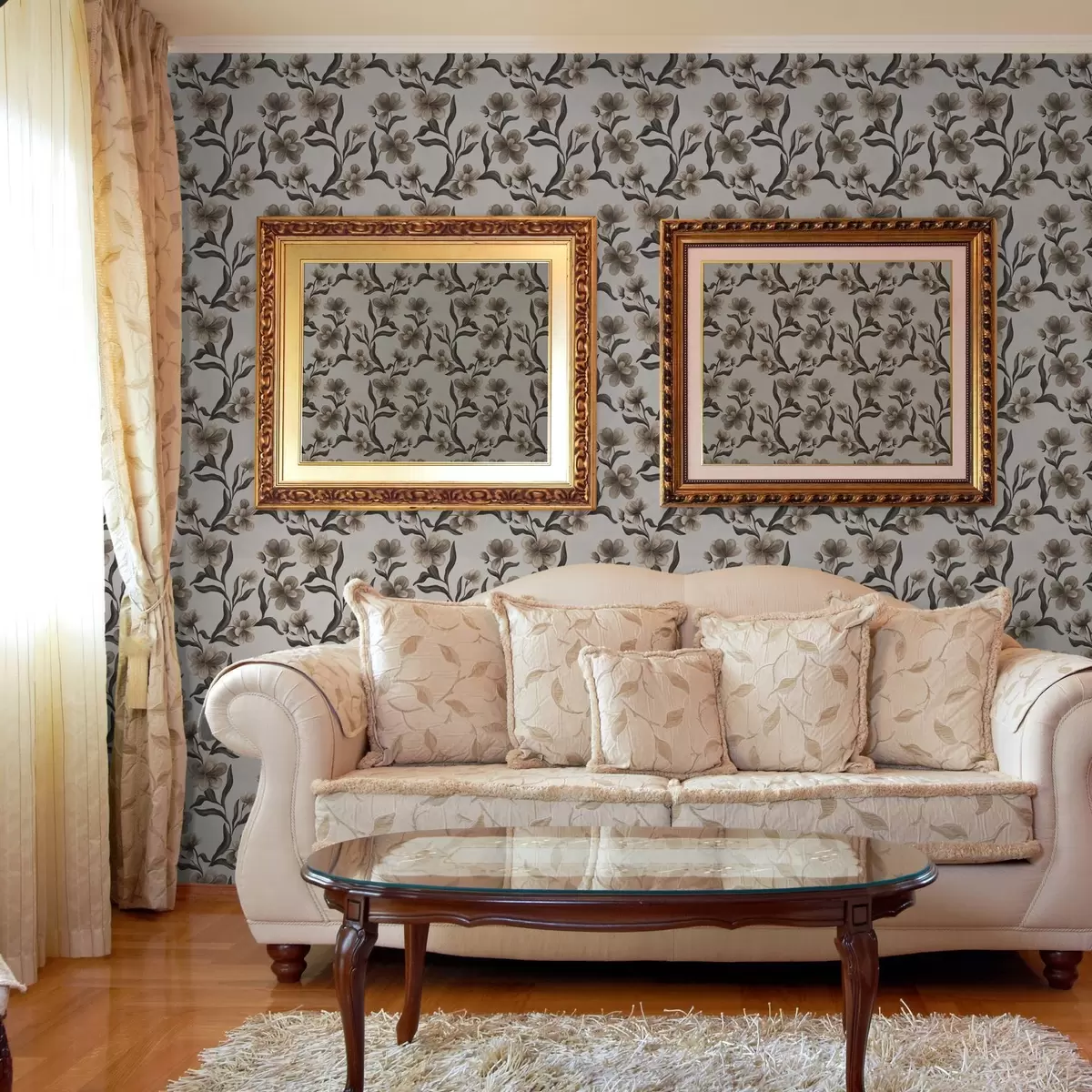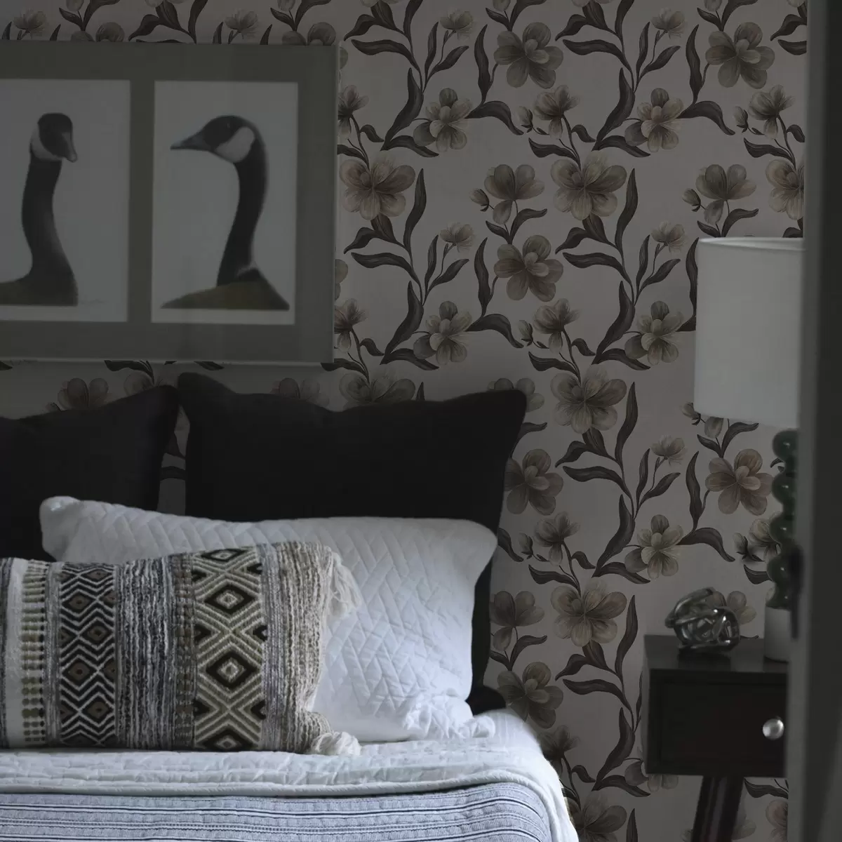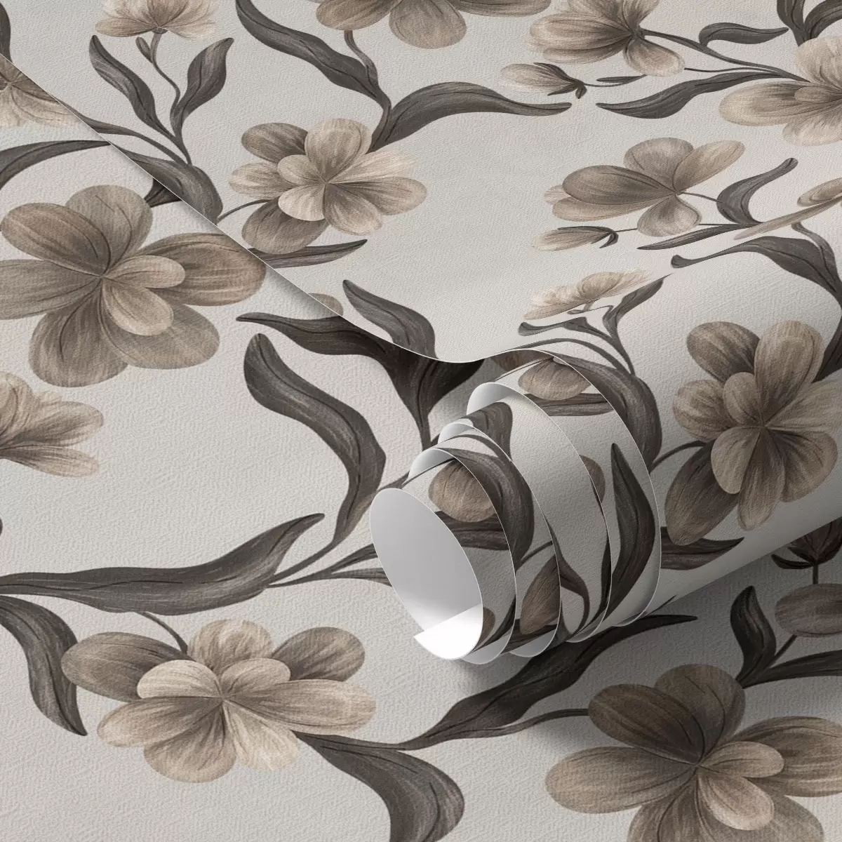 Tapetai Smėlio spalvos gėlės ir tamsūs šakos ant šviesiai pilko fono Nr. a00626v1