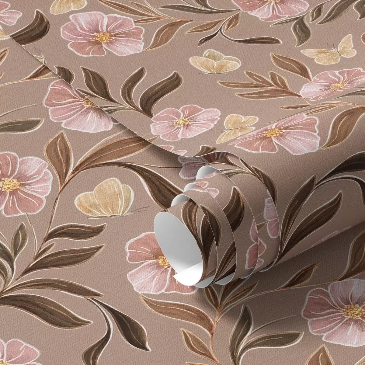 Tapetai Rožinės gėlės ir drugeliai ant šilto rudo fono Nr. a00633v1