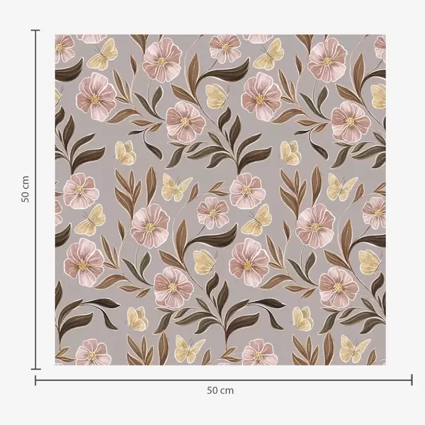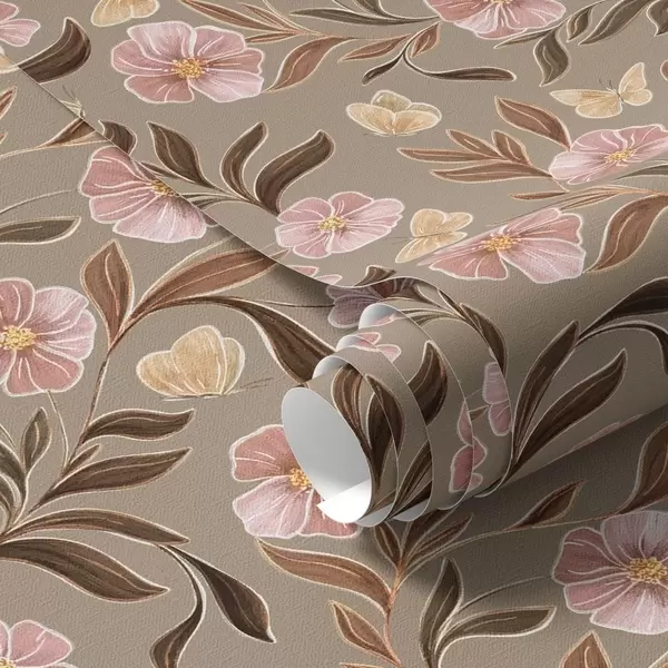 Tapetai Rožinės gėlės ir drugeliai ant alyvuogių-smėlio spalvos fono Nr. a00633v2