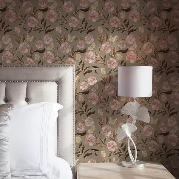 Tapetai Rožinės gėlės ir drugeliai ant alyvuogių-smėlio spalvos fono Nr. a00633v2
