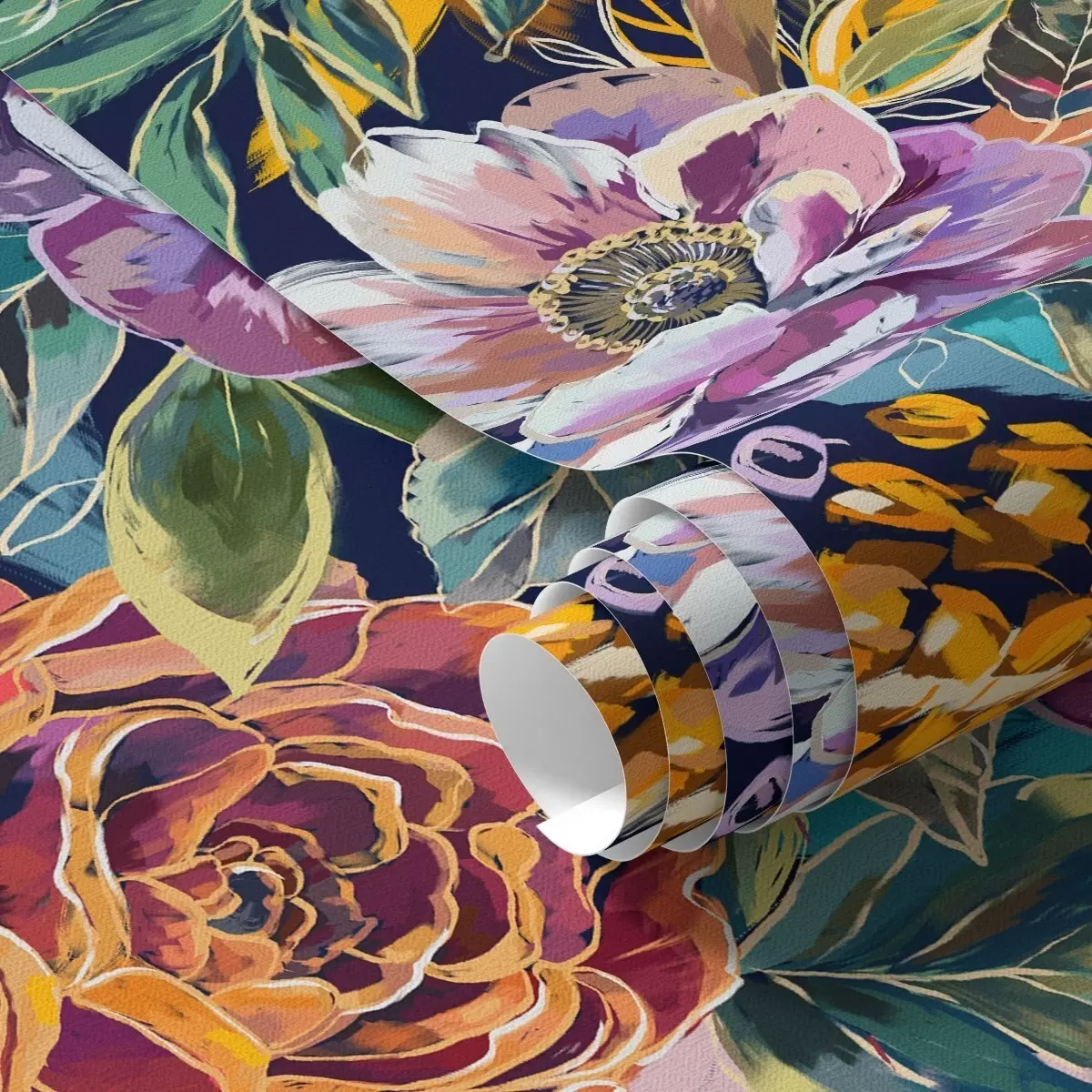 Tapetai Ryškūs, dideli, teptuku tapyti gėlės ant tamsiai mėlyno fono Nr. a00643