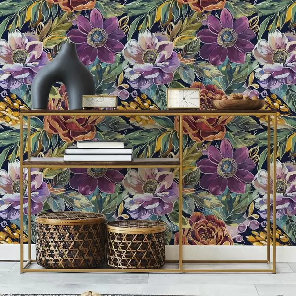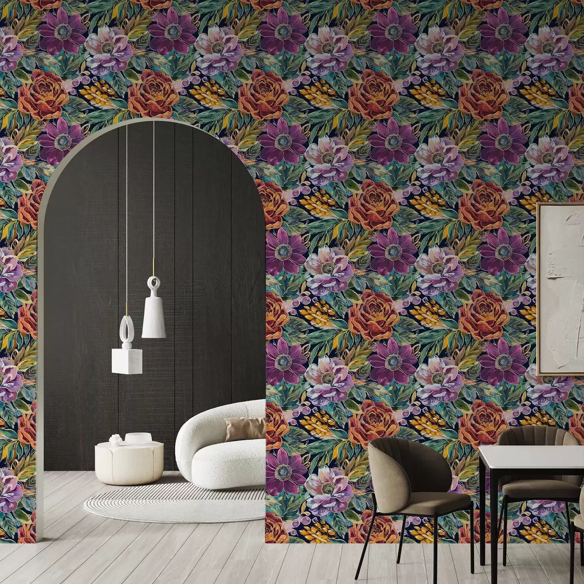 Tapetai Ryškūs, dideli, teptuku tapyti gėlės ant tamsiai mėlyno fono Nr. a00643