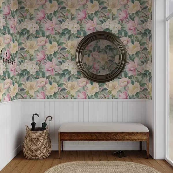 Tapetai Magnolijos ir balti žiedai ant mėtų pilkos spalvos fono Nr. a00644
