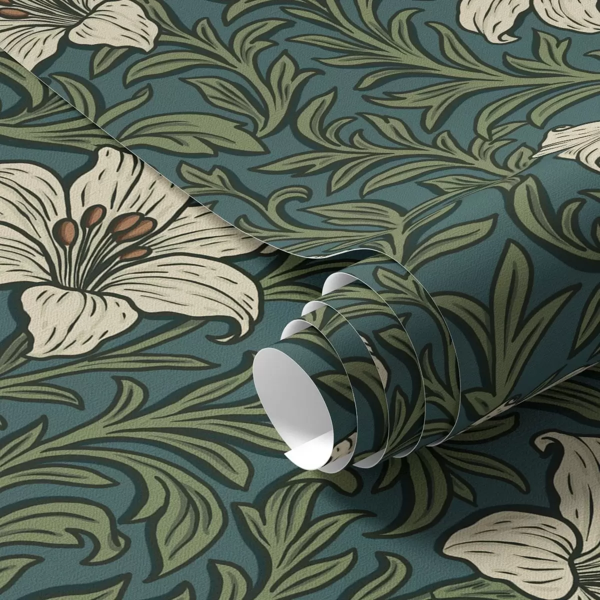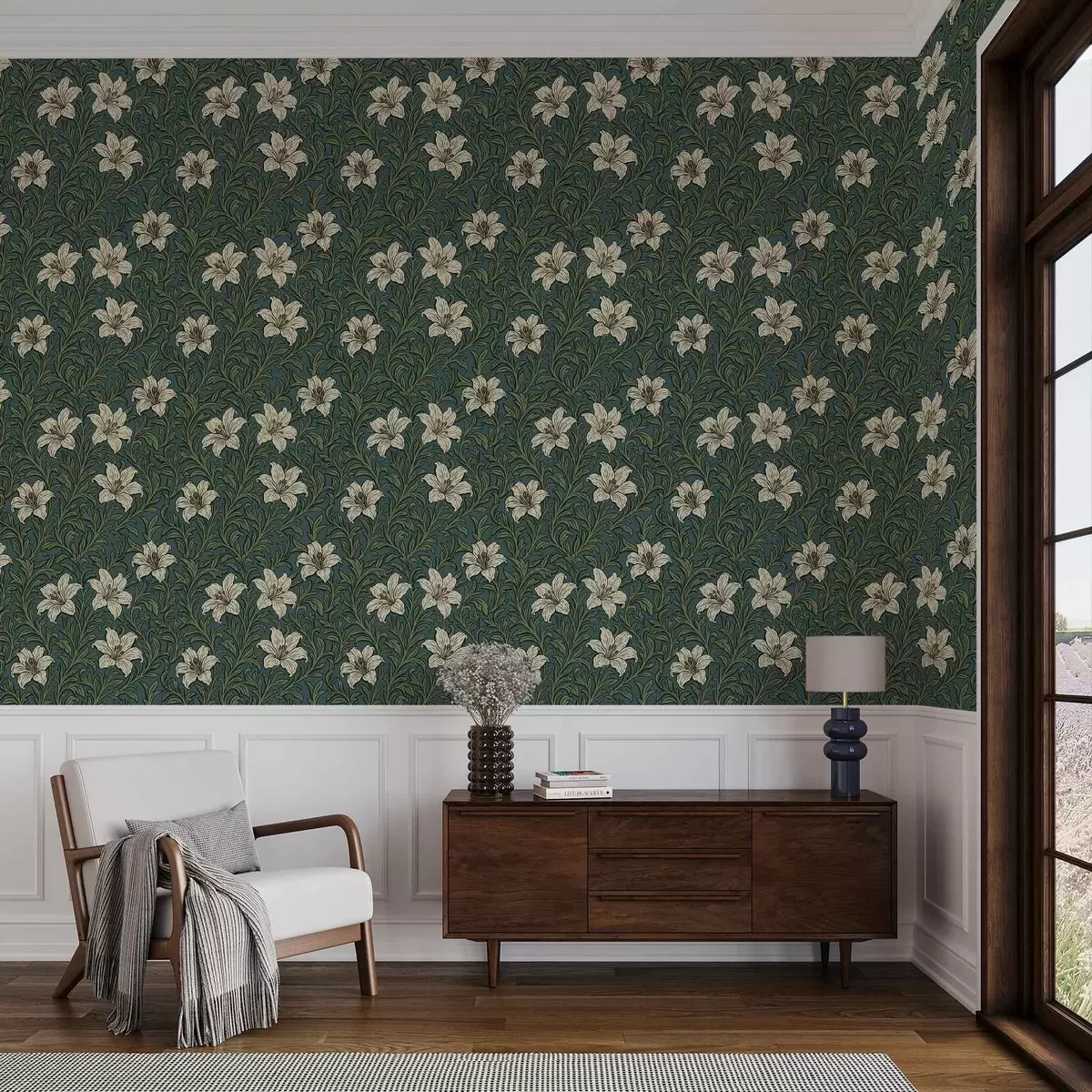 Tapetai Kreminės lelijos tarp tankios žalumos ant turkio fono Nr. a00645