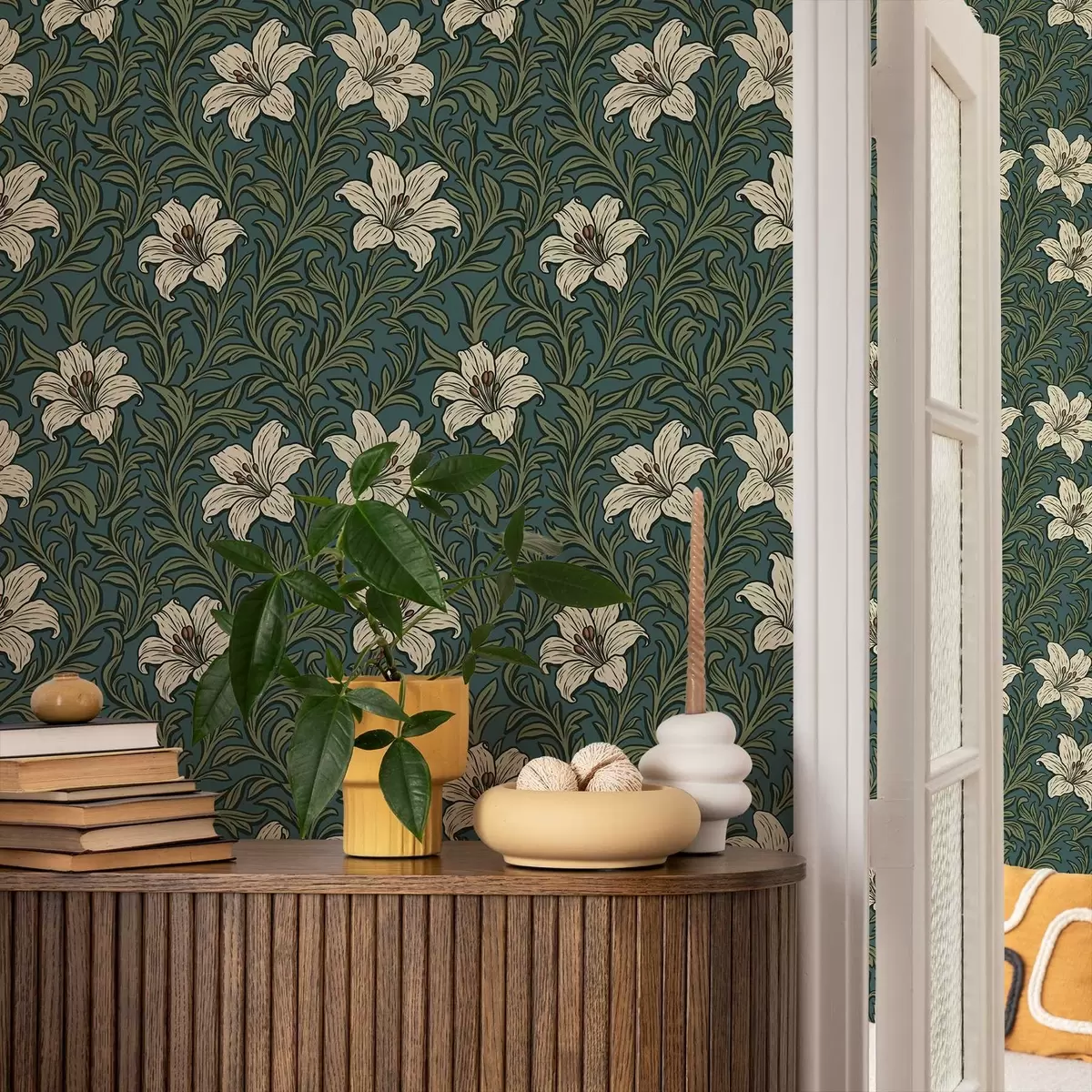 Tapetai Kreminės lelijos tarp tankios žalumos ant turkio fono Nr. a00645