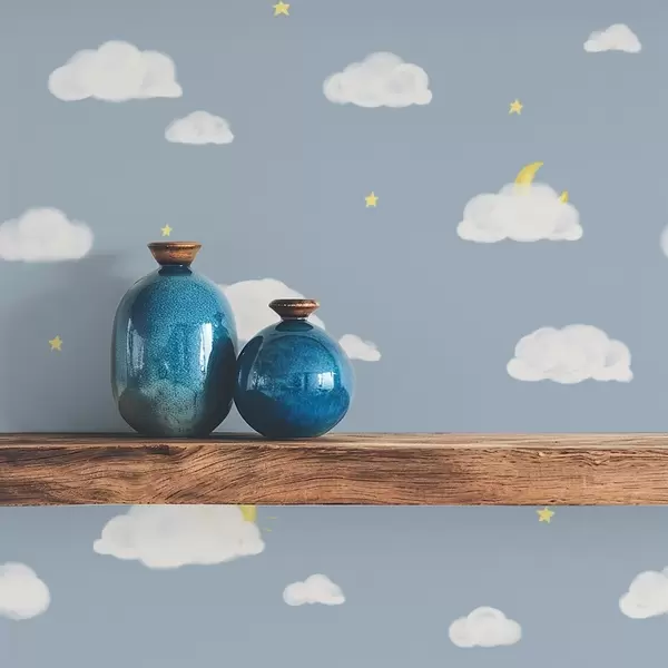 Tapetai Minkšti debesys, žvaigždės ir saulė mėlyname fone Nr. a00652