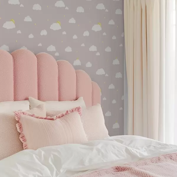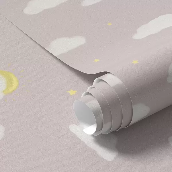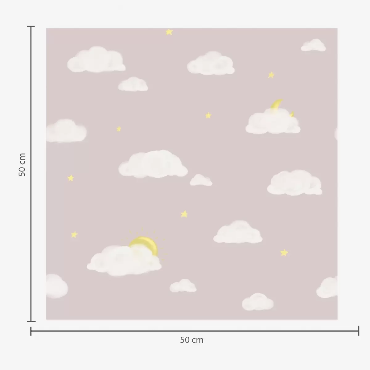 Tapetai Minkšti debesys, žvaigždės ir saulė rausvai pilkame fone Nr. a00652v2