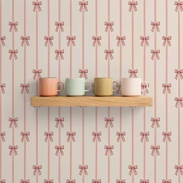 Tapetai Vertikalios juostelės su kaspinais, dramblio kaulo spalvos fonas Nr. a00653