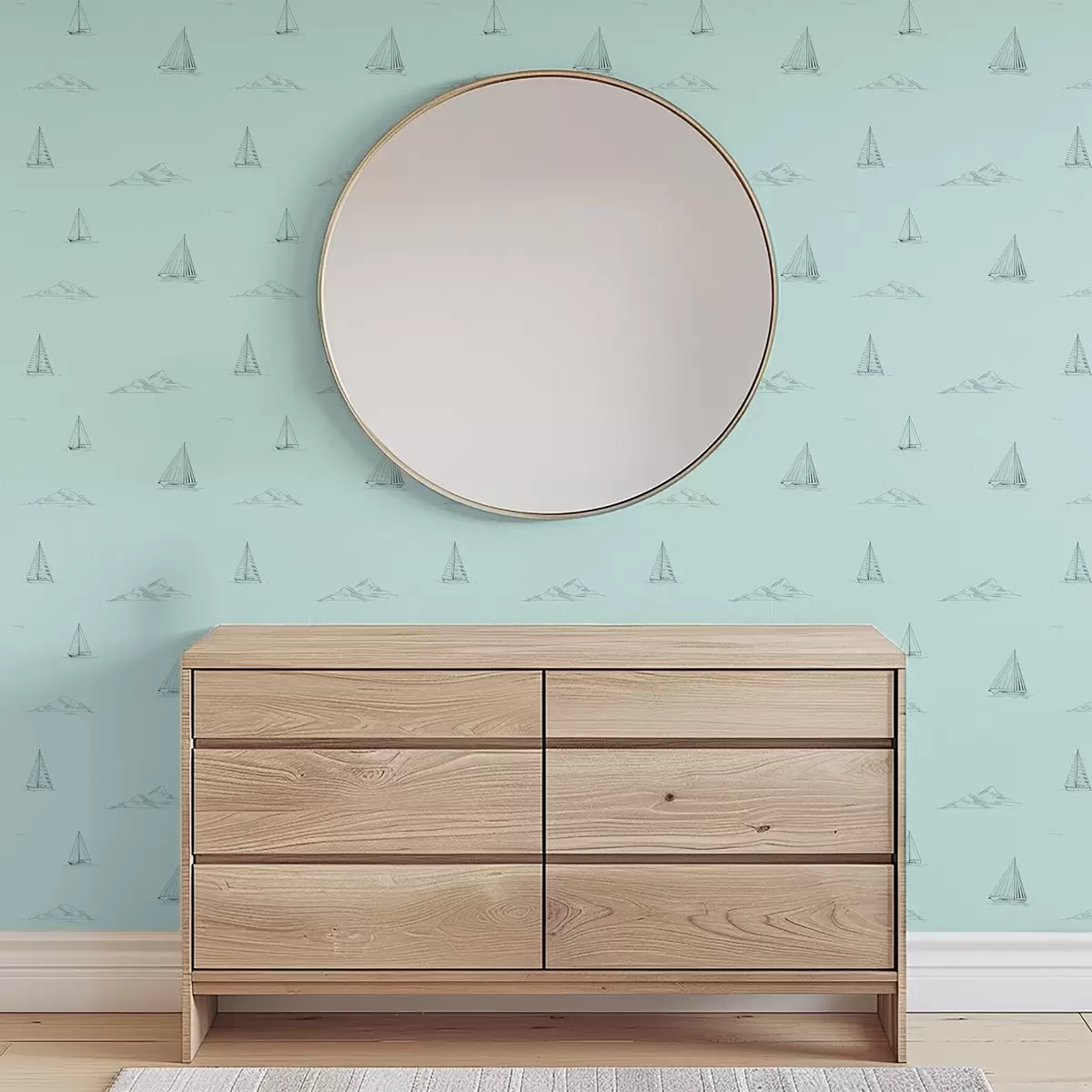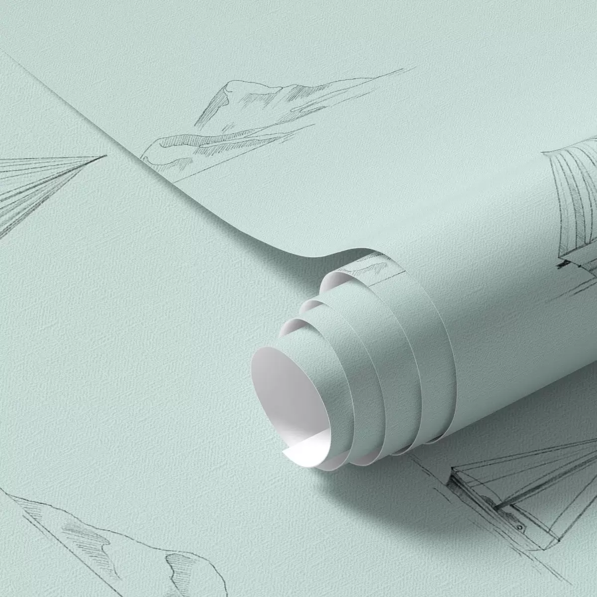 Tapetai Pieškite jachtas ir salas, mėtų žalios spalvos fone Nr. a00654v4