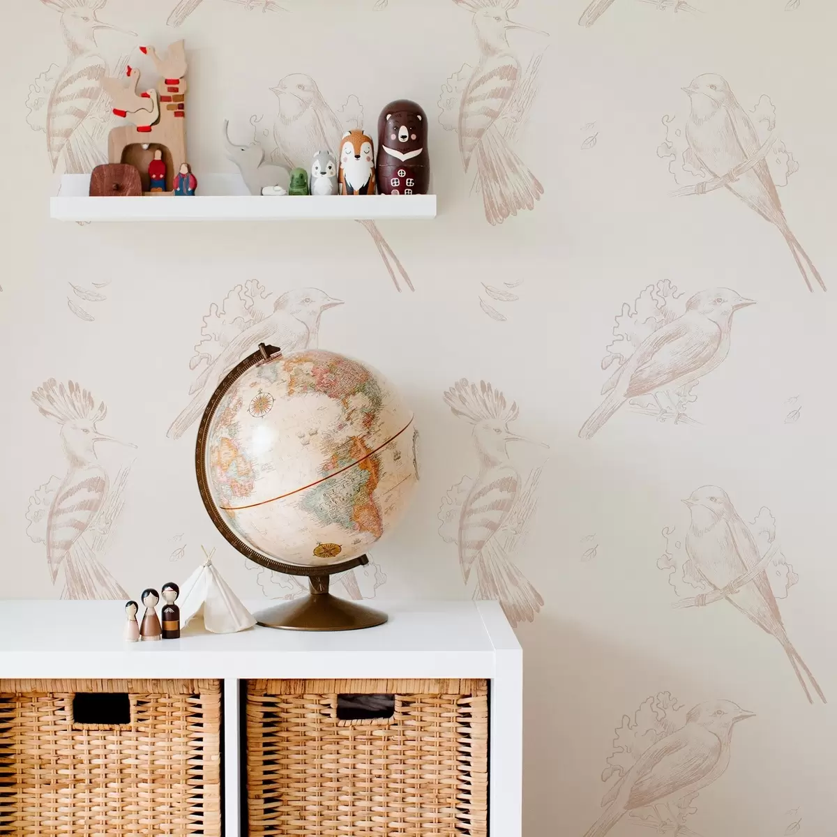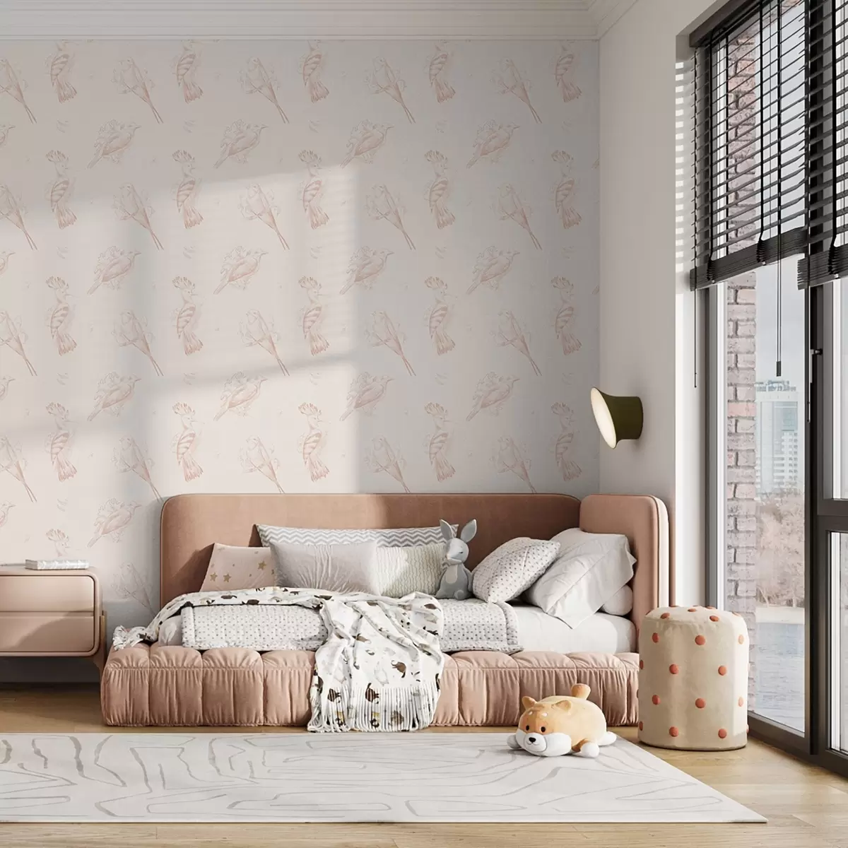 Tapetai Paukščių audinys: paukščių eskizai ant persikų-kreminės spalvos audinio Nr. a00656v2