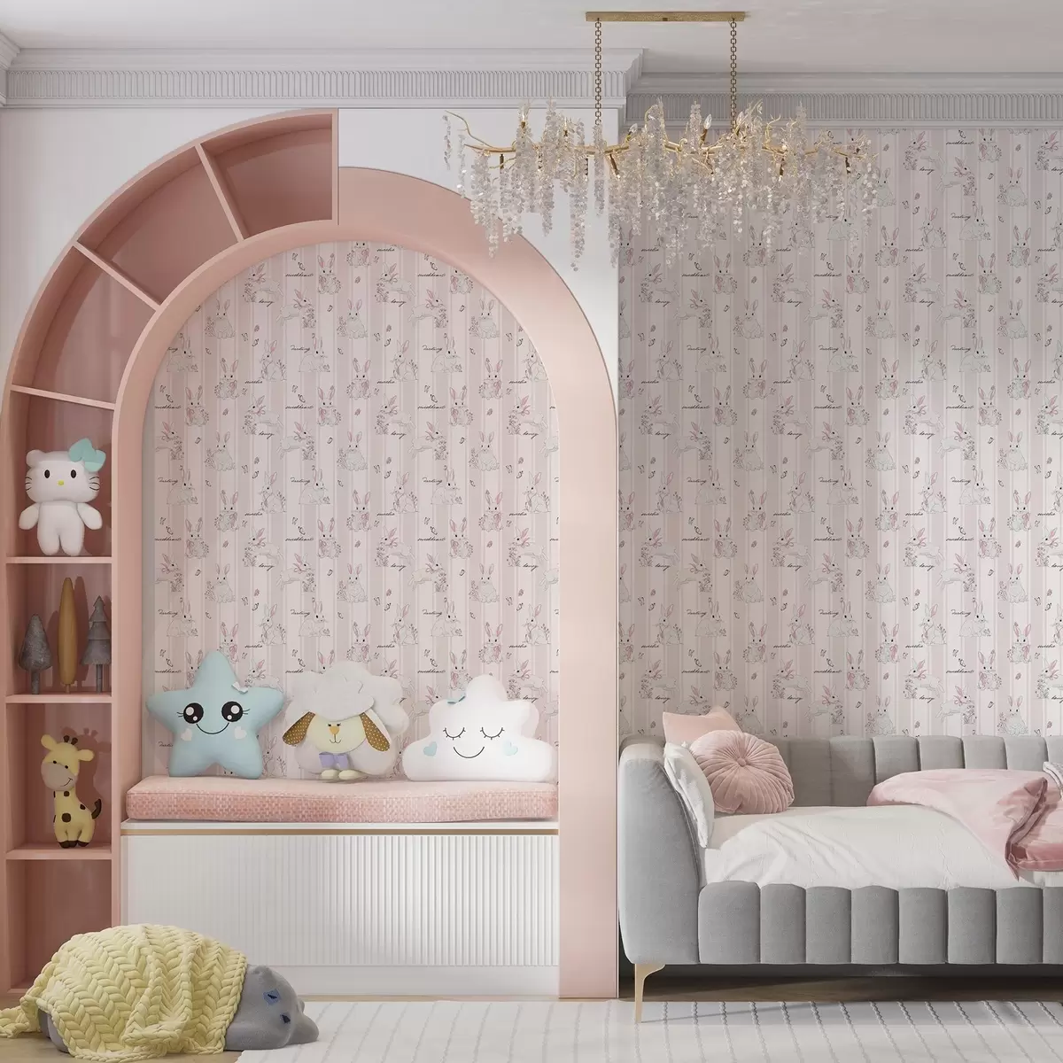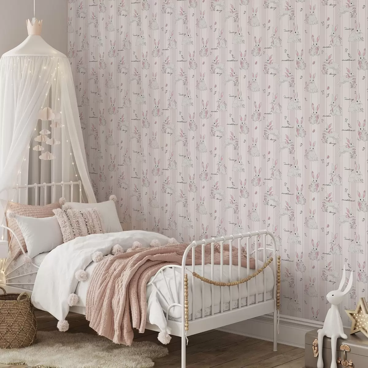 Tapetai Zuikiai su kaspinais, rožinėmis juostelėmis ir mažais užrašais Nr. a00657