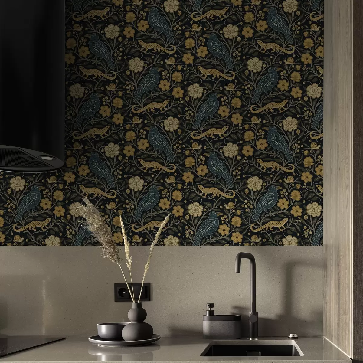 Tapetai Paukščiai, driežai ir sraigės tarp gėlių ant tamsaus fono Nr. a00691