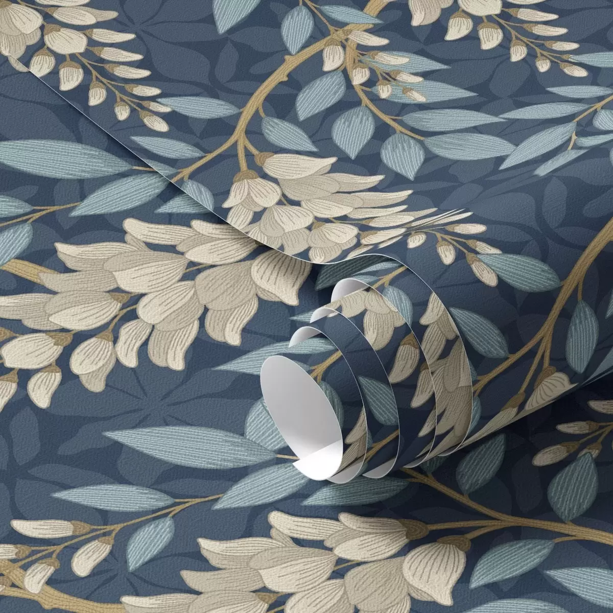 Tapetai Glicinija su mėlynomis lapais ant tamsiai mėlyno fono Nr. a00694v2