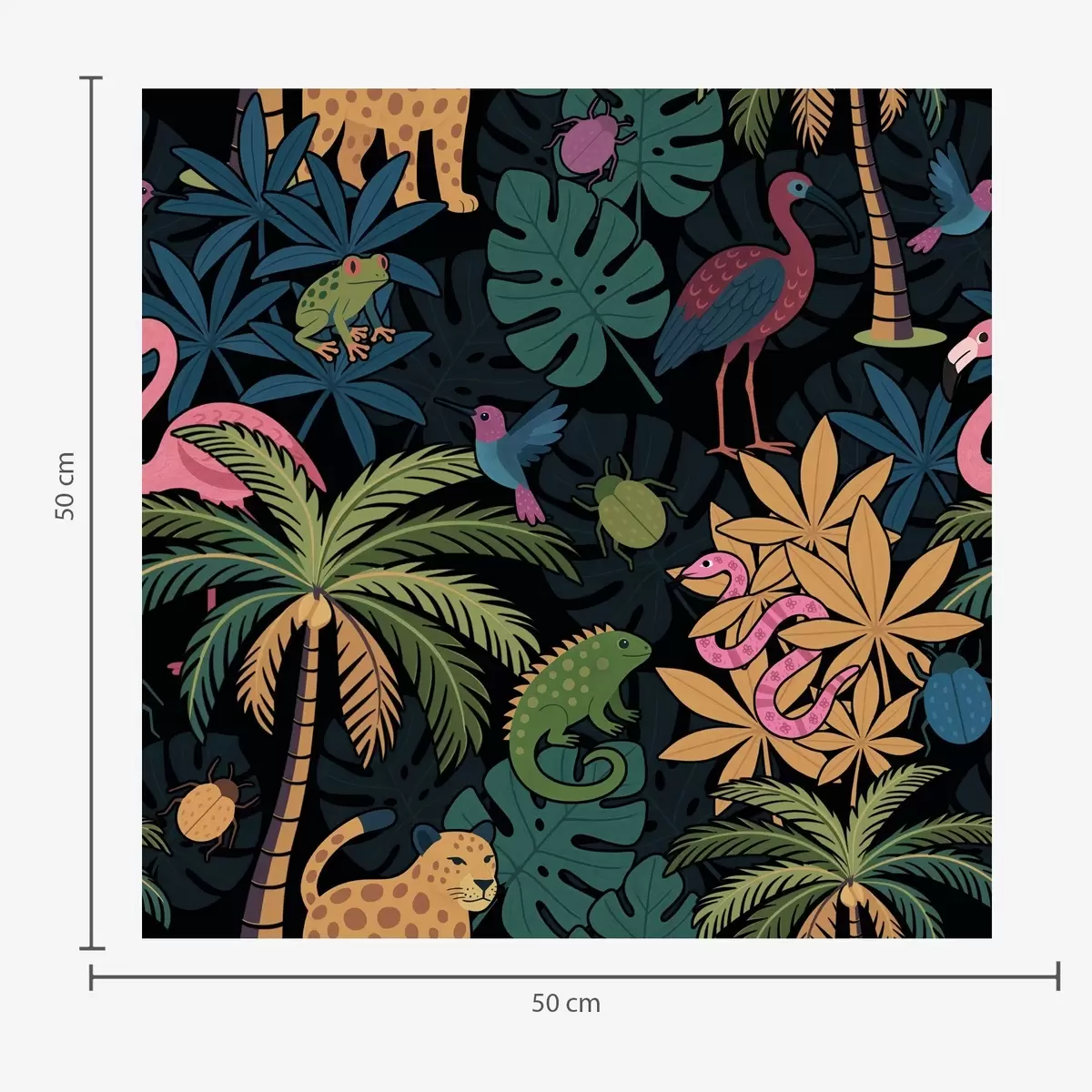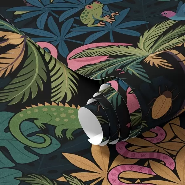 Tapetai Ryškūs tropiniai gyvūnai tarp lapijos ant tamsaus fono Nr. a00701