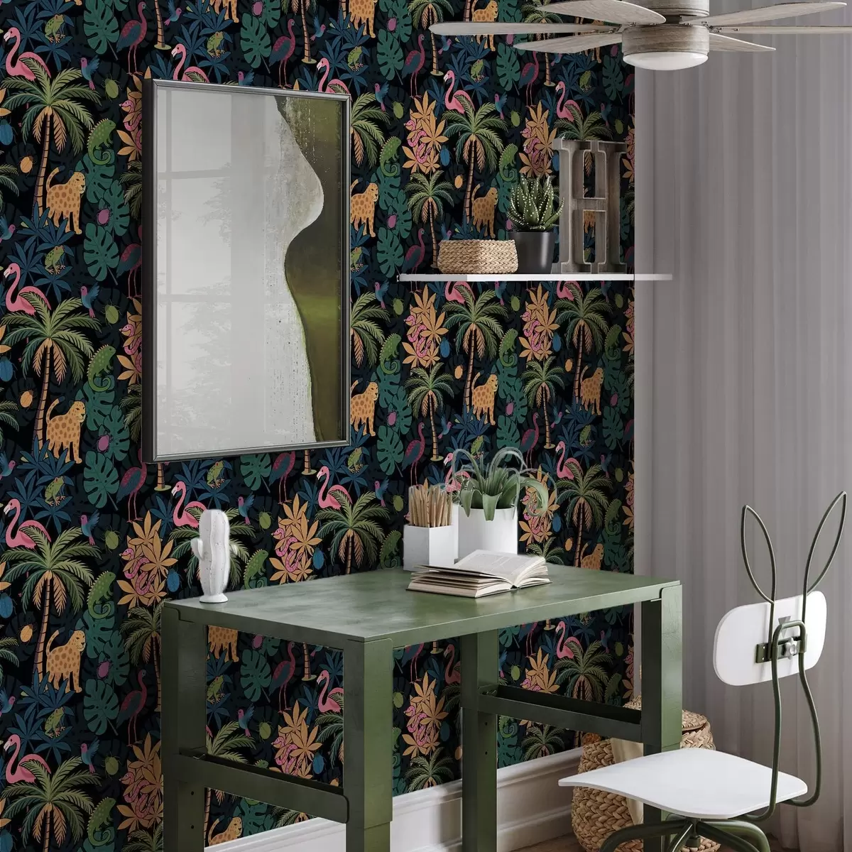 Tapetai Ryškūs tropiniai gyvūnai tarp lapijos ant tamsaus fono Nr. a00701