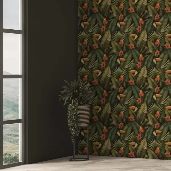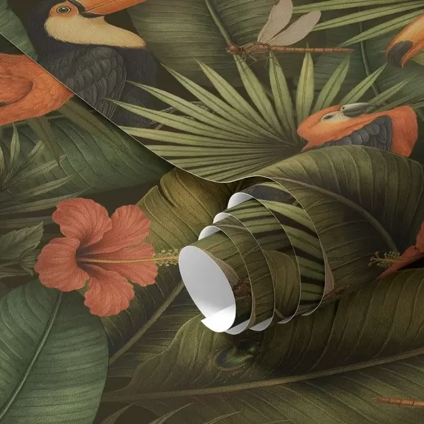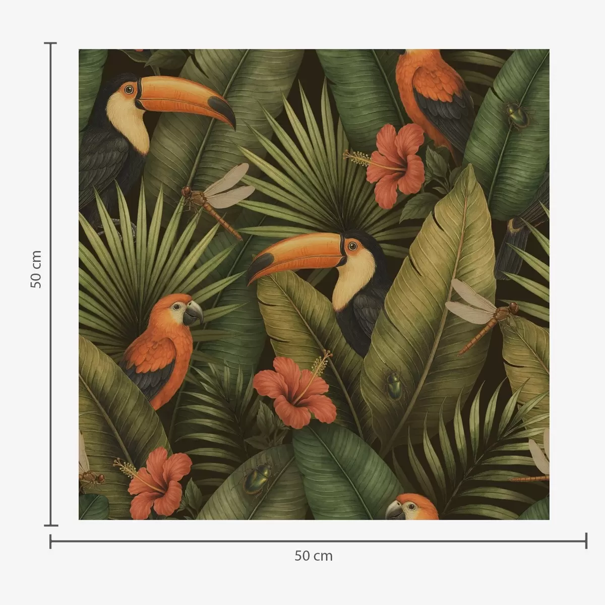 Tapetai Tukanas ir papūgos tarp tropinių lapų ir gėlių Nr. a00702
