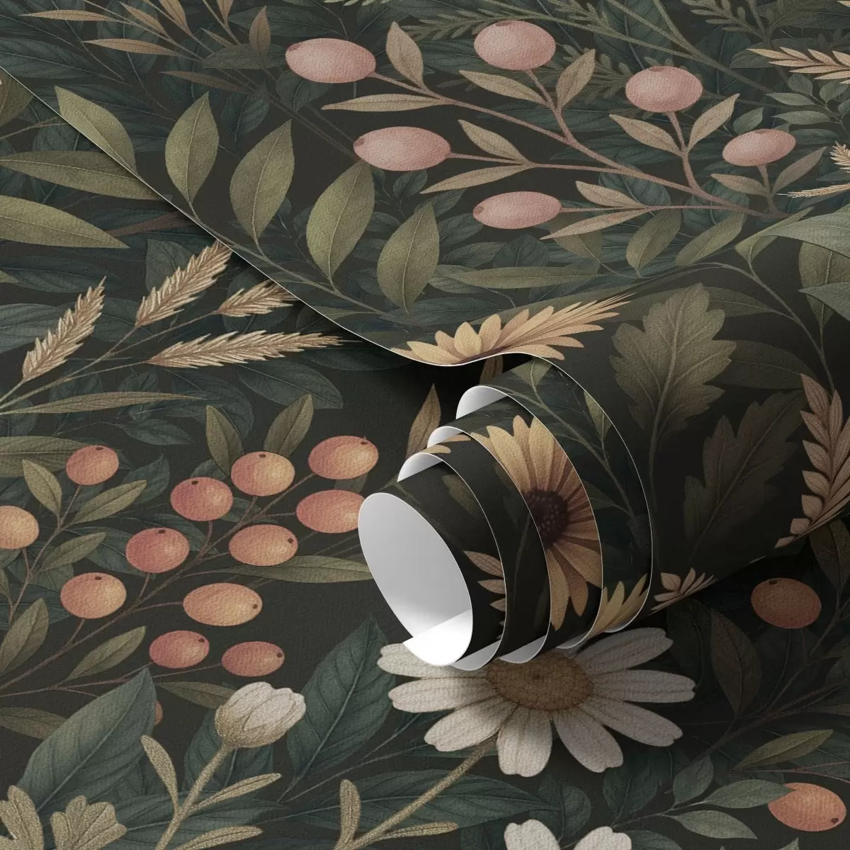 Tapetai Laukinės gėlės ir uogos ant tamsaus fono, natūralus ornamentas Nr. a00707