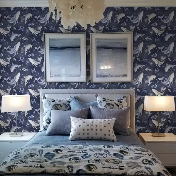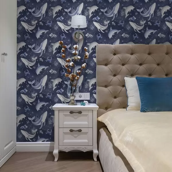 Tapetai Jūros banginiai, delfinai ir krabai tamsiai mėlyname fone Nr. a00720