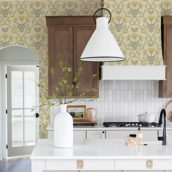Tapetai Ornamentas su tulpėmis, paukščiais ir drugeliais, ochra Nr. a00722