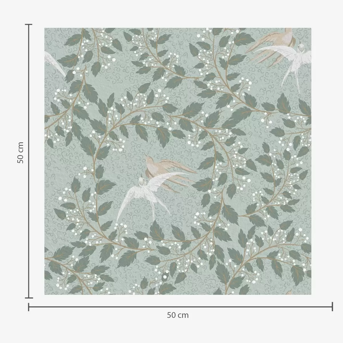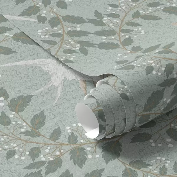 Tapetai Šakos su baltomis uogomis ir paukščiais ant žalios fono Nr. a00731